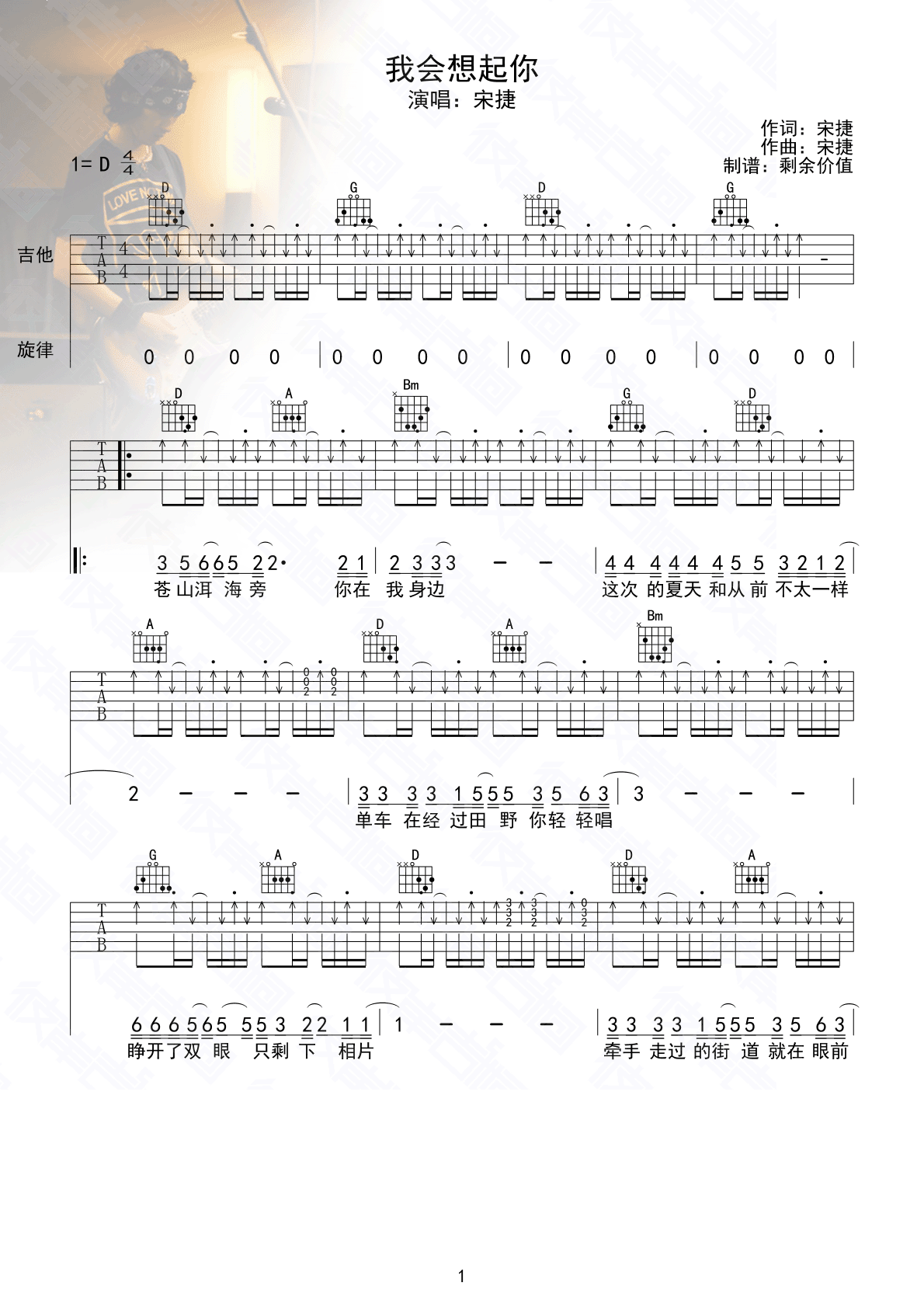 我会想起你吉他谱 - 宋捷 - D调吉他弹唱谱