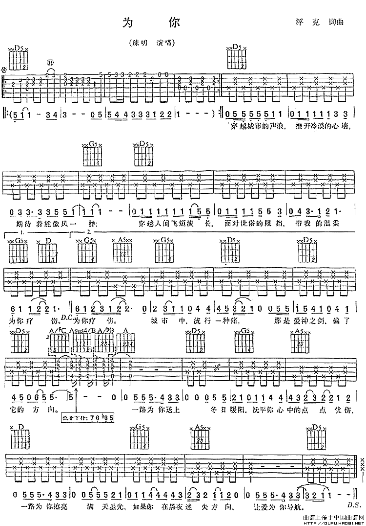 曲谱介绍: 陈明《为你》吉他弹唱谱,采用D调指法编配,中国曲谱网编配出品,共有1张高清图谱,免翻页排版设计。