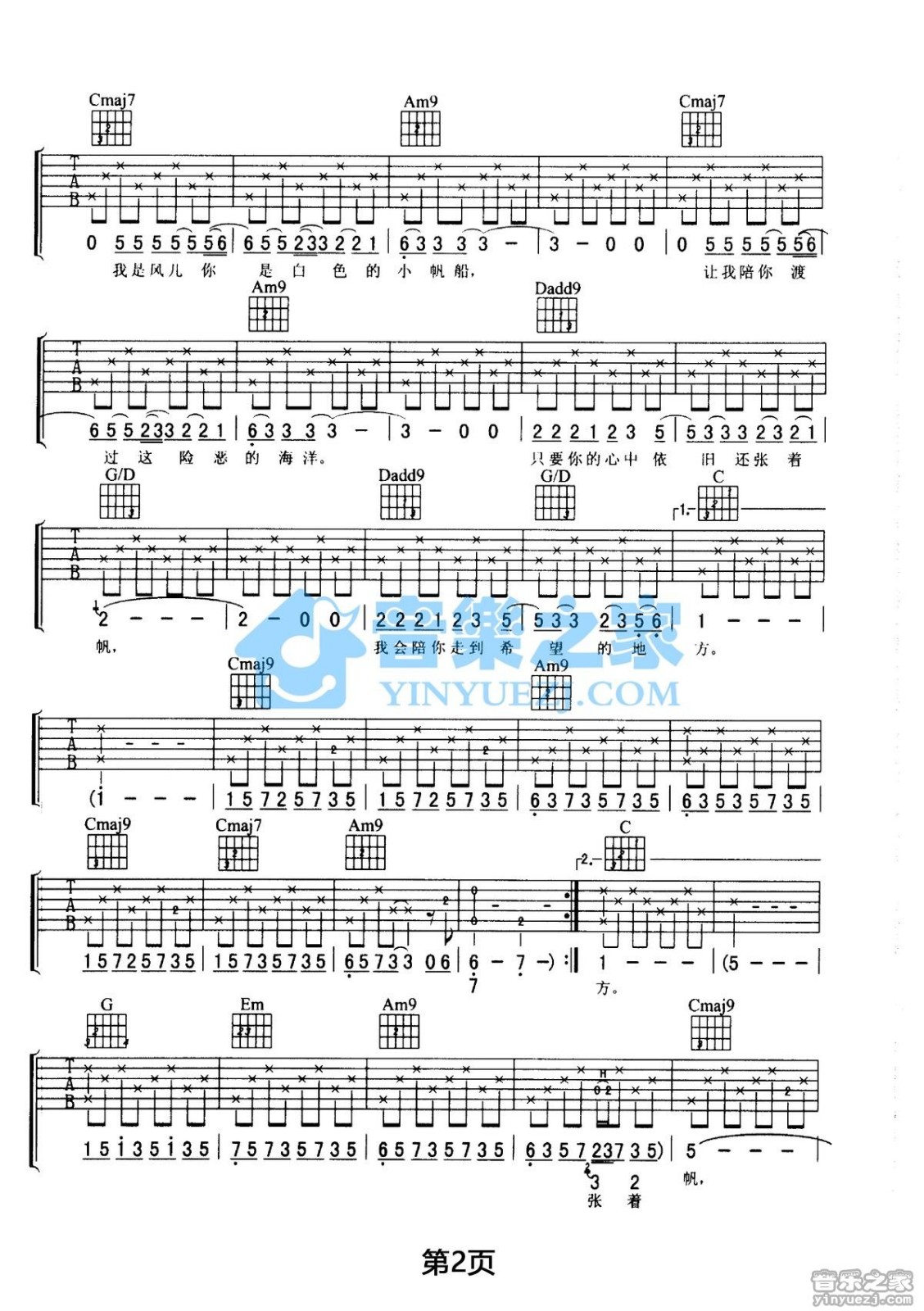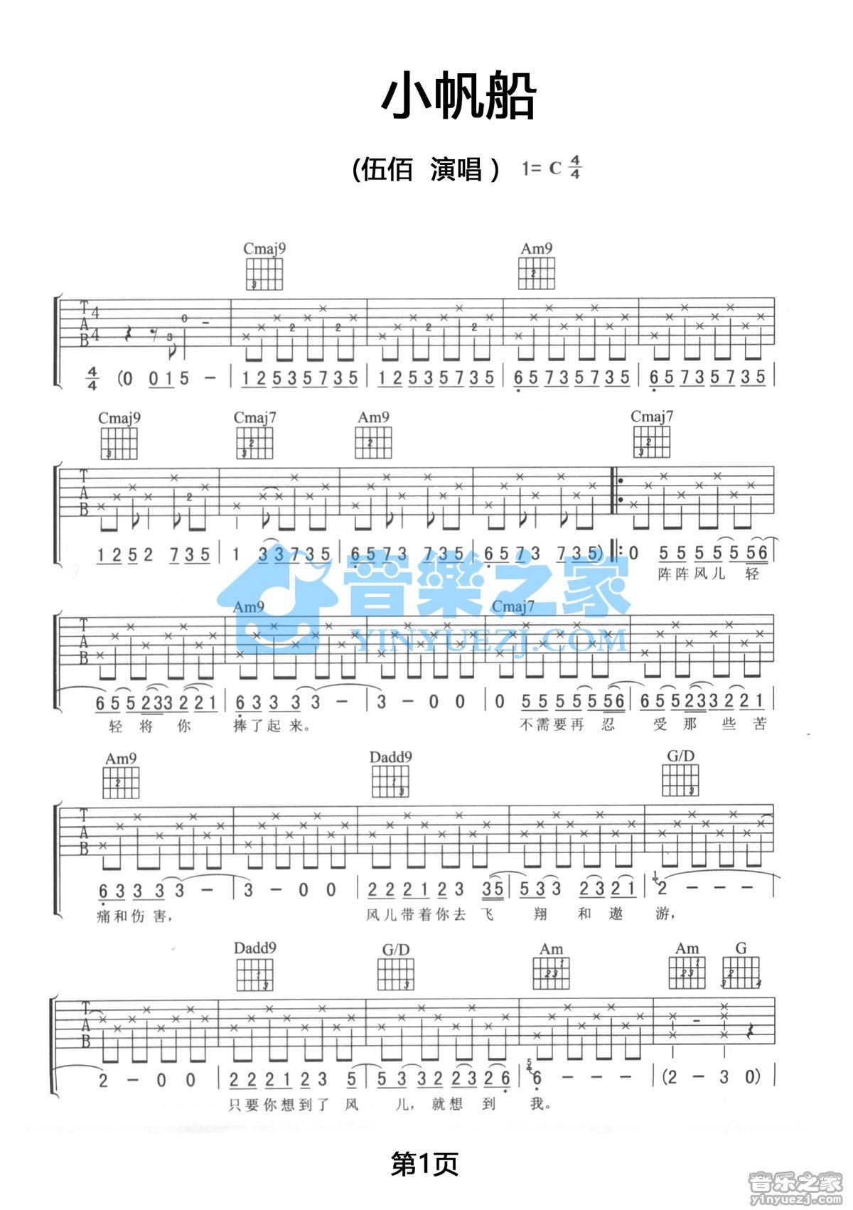 曲谱介绍: 伍佰《小帆船》吉他弹唱谱,采用C调指法编配,音乐之家编配出品,共有3张高清图谱。