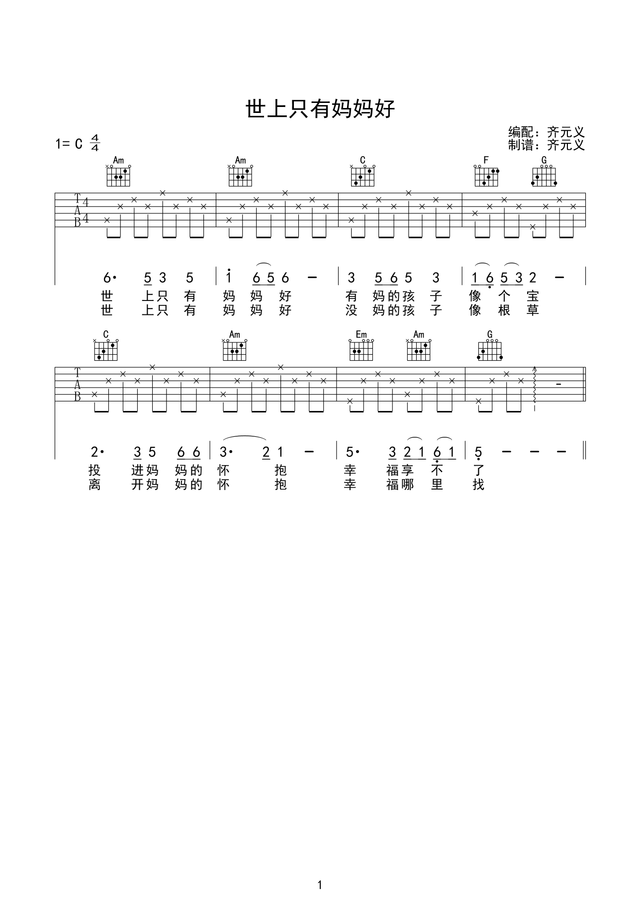 曲谱介绍: 儿歌《世上只有妈妈好》吉他弹唱谱,采用C调指法编配,齐元义编配出品,共有1张高清图谱,免翻页排版设计。