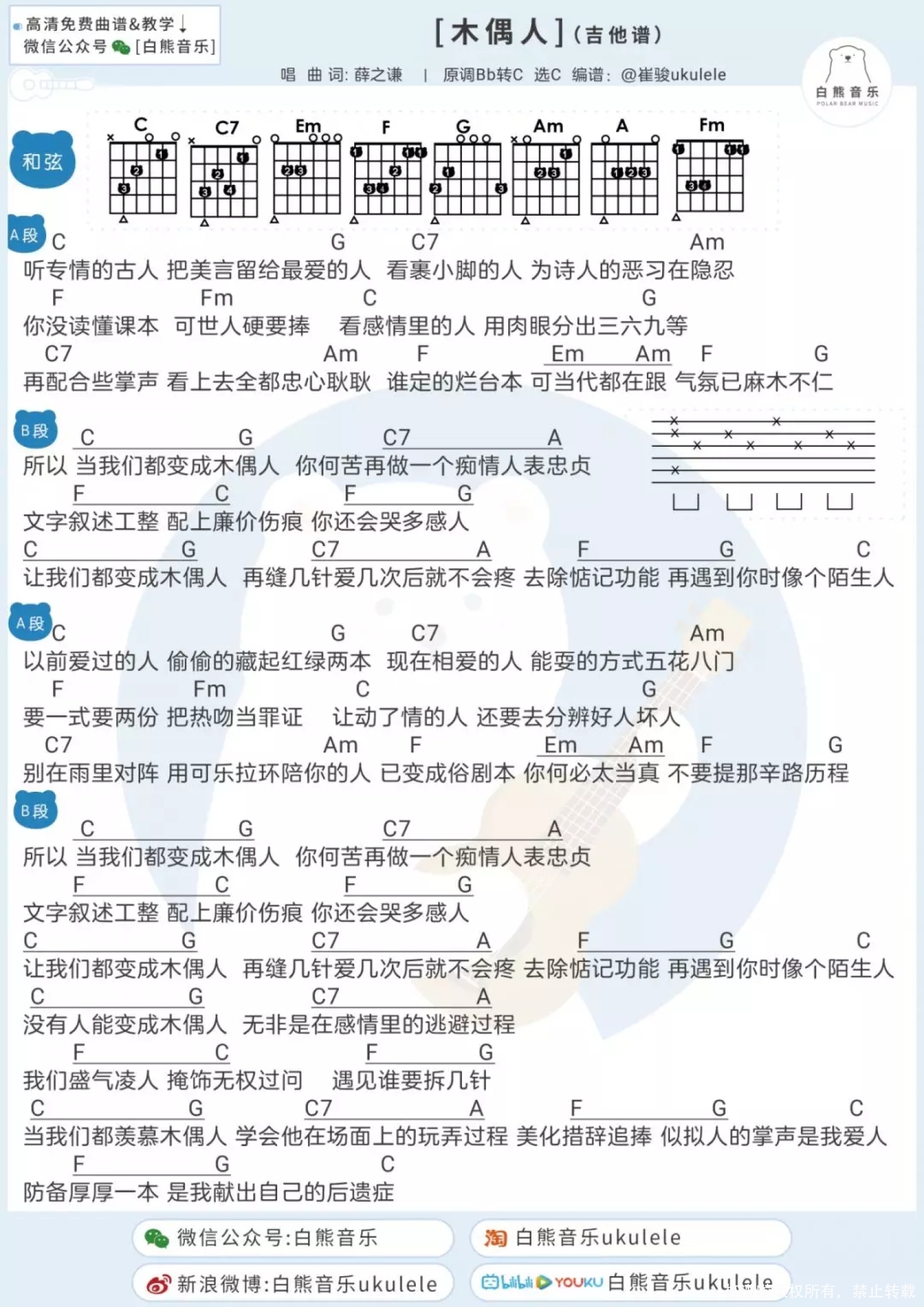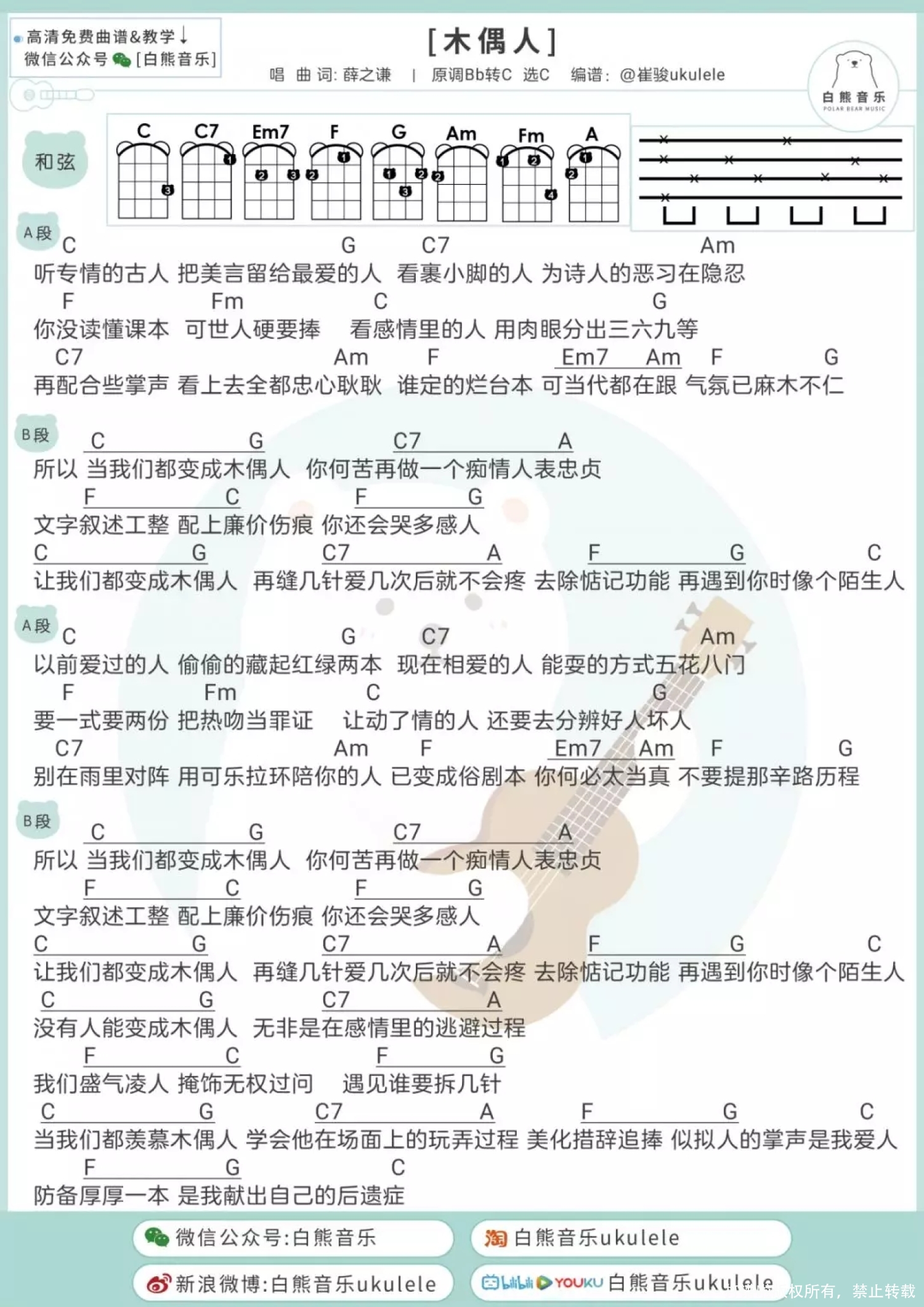 木偶人尤克里里谱 - 薛之谦