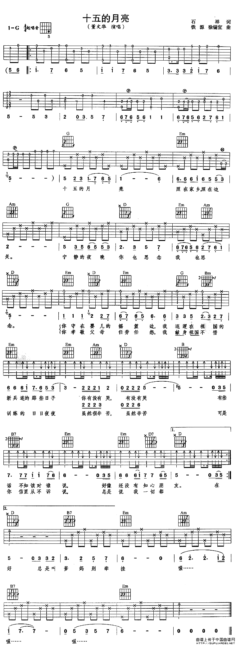 曲谱介绍: 董文华《十五的月亮》吉他弹唱谱,采用G调指法编配,中国曲谱网编配出品,共有1张高清图谱,免翻页排版设计。