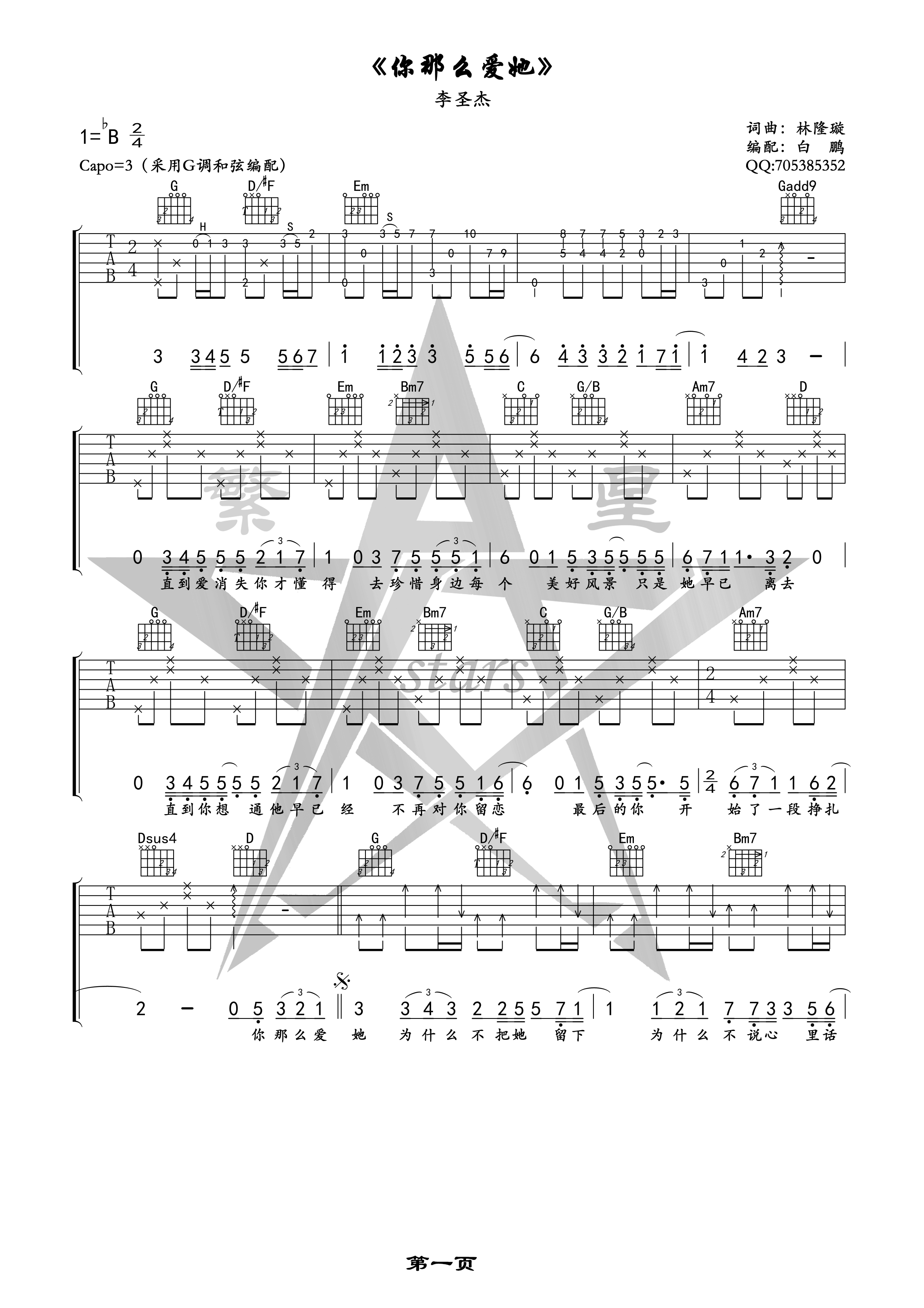 曲谱介绍: 李圣杰《你那么爱他》吉他弹唱谱,采用B调指法编配,白鹏编配出品,共有2张高清图谱,免翻页排版设计。