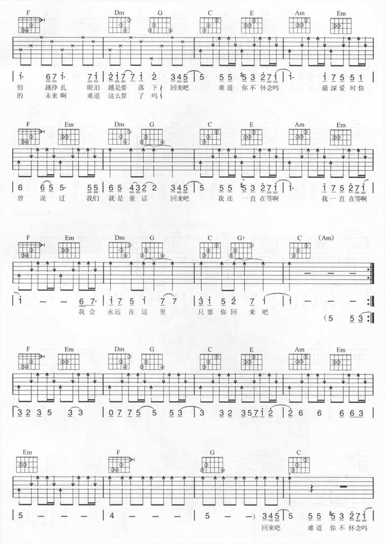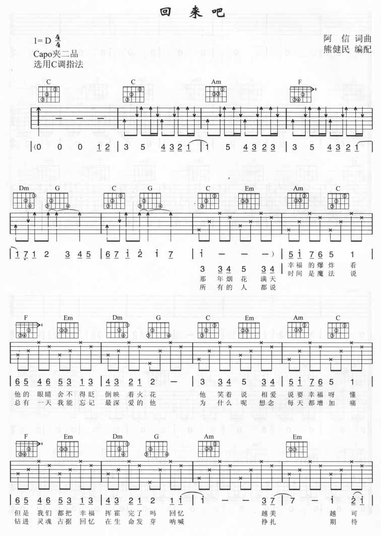 曲谱介绍: 五月天《回来吧》吉他弹唱谱,采用C调指法编配,熊建民编配出品,共有4张高清图谱。