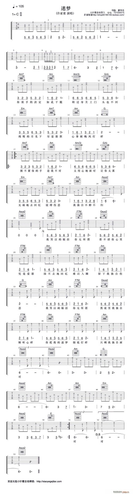 曲谱介绍: 许亚童《迷梦》吉他弹唱谱,采用C调指法编配,共有1张高清图谱,免翻页排版设计。
