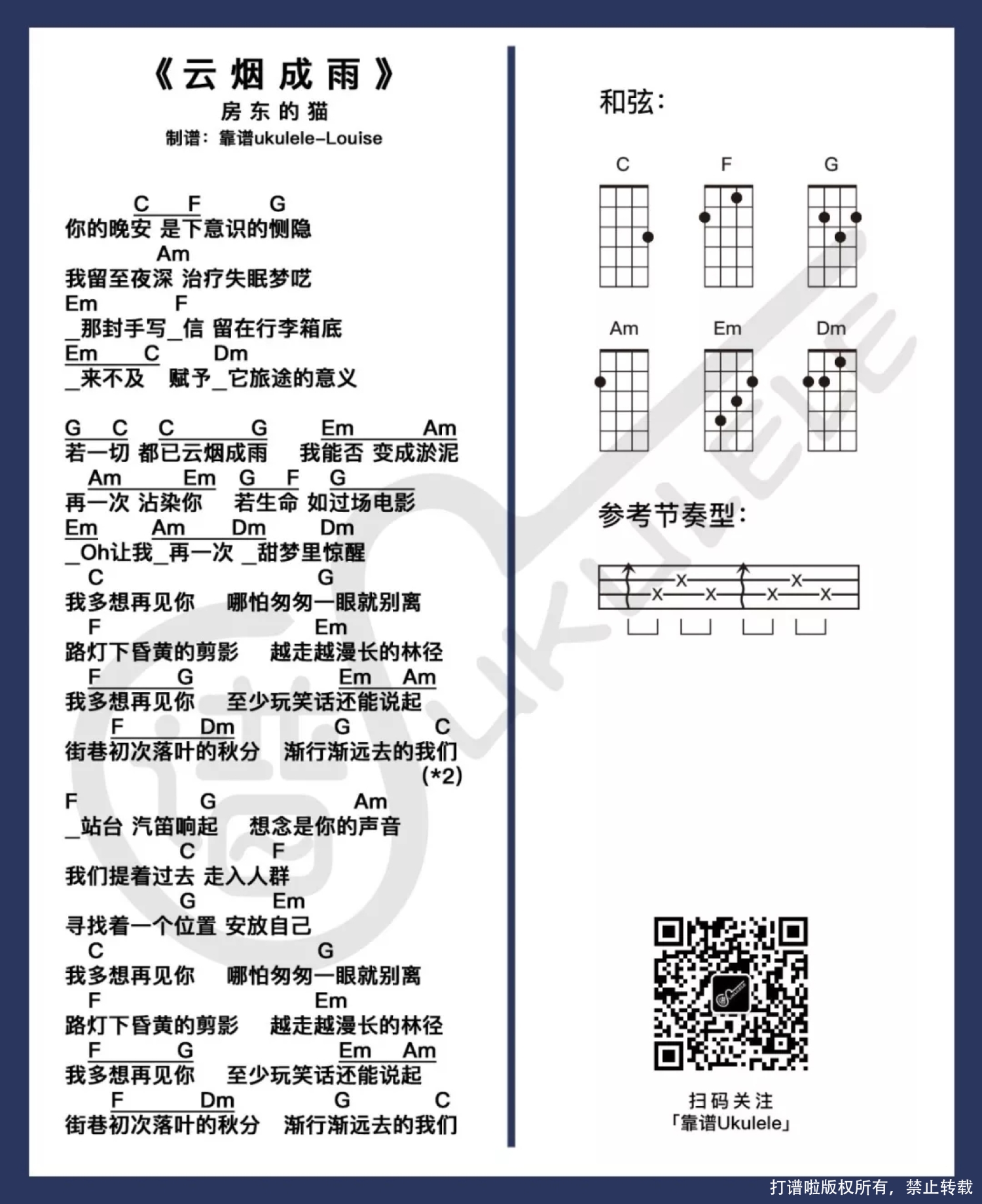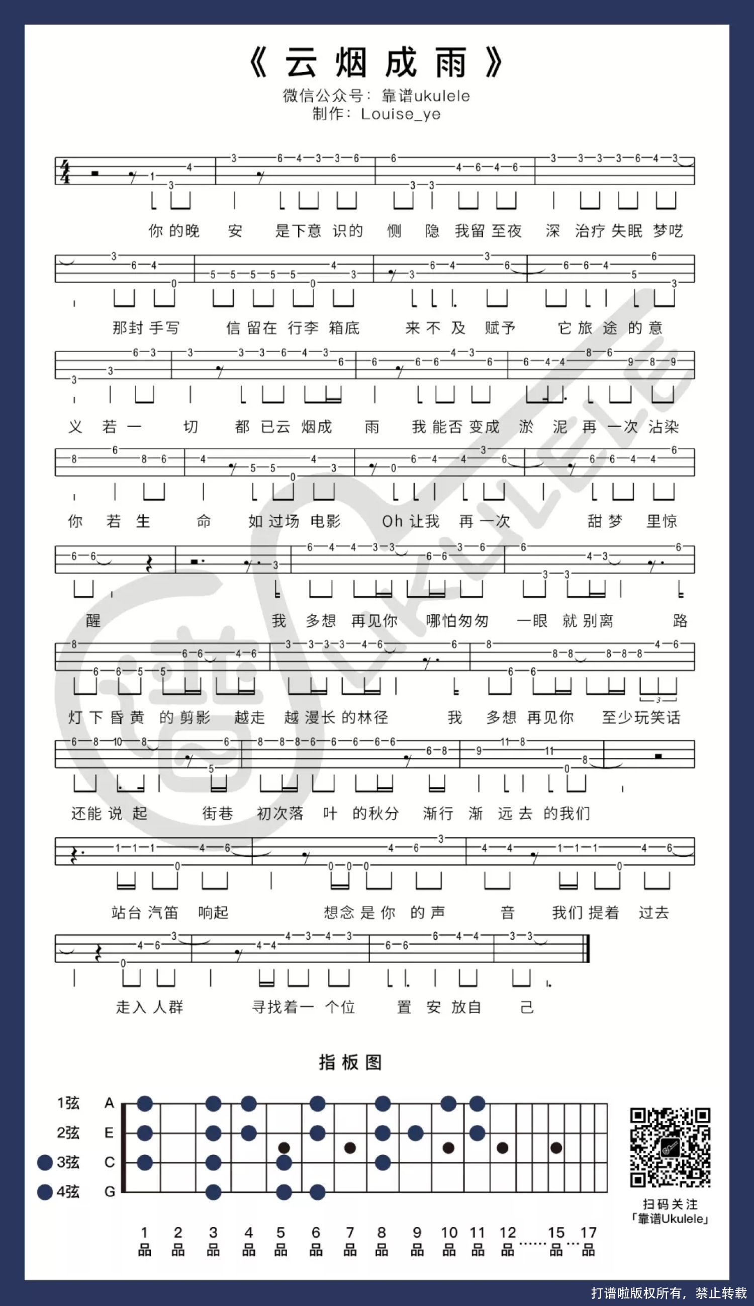 《云烟成雨》是动画片《我是江小白》的片尾曲,另外还是首因为抖音,从小众歌变身成为榜单飙升作品…… “……我多想再见你/哪怕匆匆一眼就别离/路灯下昏黄的剪影/越走越漫长的林径/我多想再见你/至少玩笑话还能说起/街巷初次落叶的秋分/渐行渐远去的我们……” 这段副歌可能是大多人比较有感的一段吧……相信每个人的生命中,都有那么一次为了某个人而丢了自己,懵懂的只求在最美好的时候遇见他。也许不会有结果,也许无法拥有,在他不知道的角落默默期待……在记忆中依然喜欢…… 我偏爱还有这句“若生命如过场电影/Oh让我再一次甜梦里惊醒……”一直都在幻想着生命中的一切能像电影一般……(谁叫白天那么长,适合做白日梦呢哈哈哈哈~),能从甜美中惊醒也不错的,对吧? 难度系数:★ 和弦简单的不需要多说什么,哪怕是个新手这些和弦也是必须掌握的一组。指法如果不清楚怎么按,可以参考→《干货 | 和弦的多种指法,不完整分享》←。 云烟成雨ukulele弹唱谱 《云烟成雨》有些淡淡忧伤,旋律却很温柔,房东的猫轻轻的唱着诉说一个离别、重逢……歌中的少女情怀匆匆而过,让人沉浸在回忆之中。回不去的青春校园,年少的懵懂和遗憾,我们都在经历着……期待着……坚定着……怀念着……不断的成长,所有的一切时刻提醒着要好好走未来的每一步。 那个梦中曾经无法忘记的人,是什么时候开始真的放弃了?真正放下是无声息的,不存在黑名单,不会刻意删除,不再关注他的生活,偶尔碰到了一个简单微笑与点头……也不过如此而已,因为不会再热络的聊天,不会为了他喜怒无常,情绪失控……当初的牵挂,早已没有了犹豫,一段旅程到站,换乘后的新篇章在等你…… ▽▽▽ 难度系数:★☆ Emmm……这次的单音指弹谱不算简单了,指法有些复杂,反复调整了好多次,现在这个版本是我自己比较顺手的版本了,不知道你们呢? 建议练的时候,要留意每个小节前后需要弹奏的品格位置,及时调整指法哦,不然会有出现手指切换慌乱的情况了,节奏的部分如果使用节拍器建议可以不要太快,设置在70左右开始吧。 云烟成雨ukulele单音指弹谱