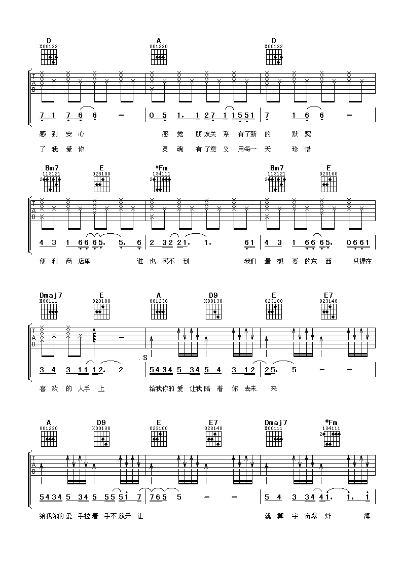 曲谱介绍: tank《给我你的爱》吉他弹唱谱,采用A调指法编配,阿潘音乐工场编配出品,共有3张高清图谱。