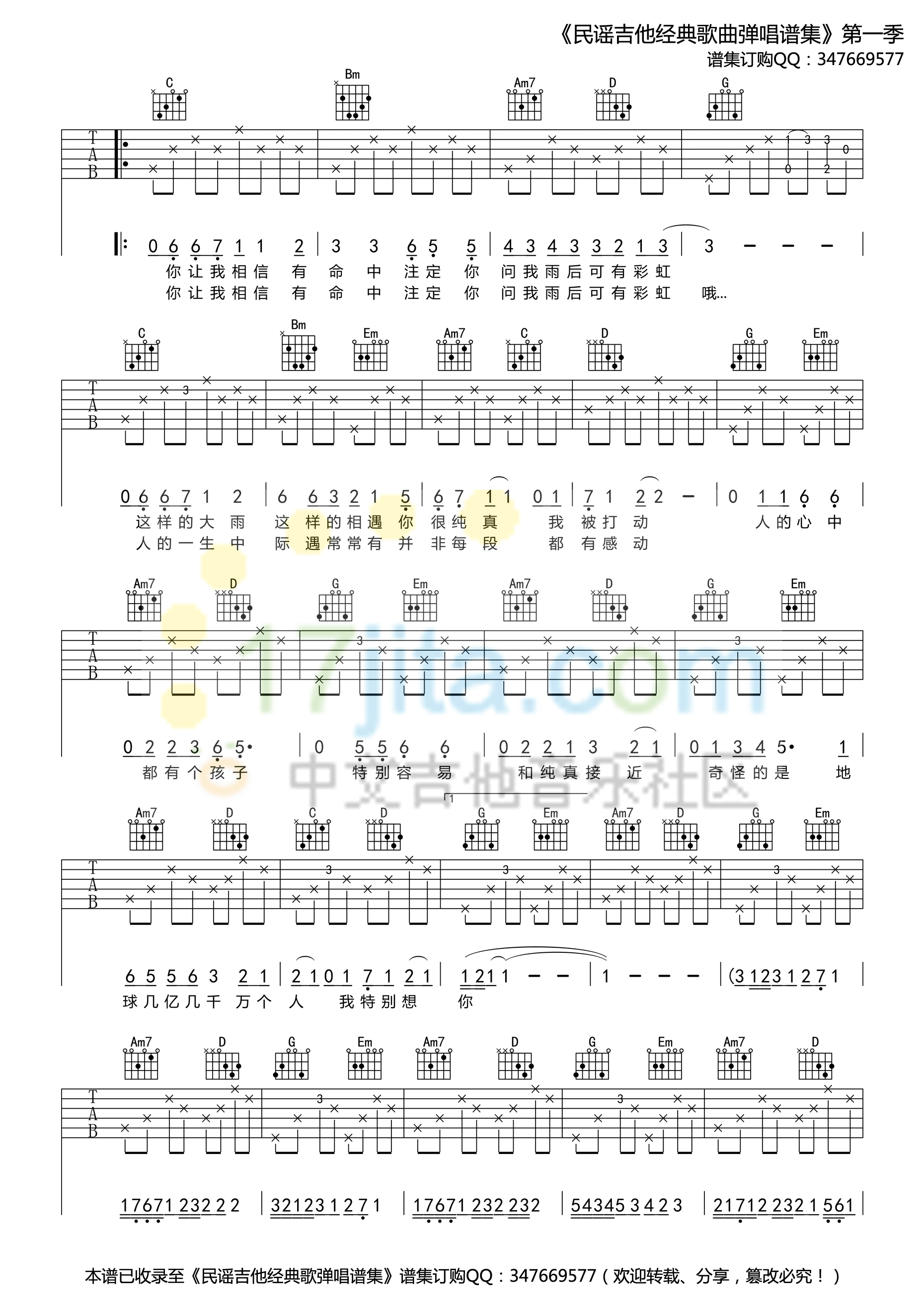 曲谱介绍: 庾澄庆《命中注定》吉他弹唱谱,采用A调指法编配,17吉他编配出品,共有3张高清图谱。