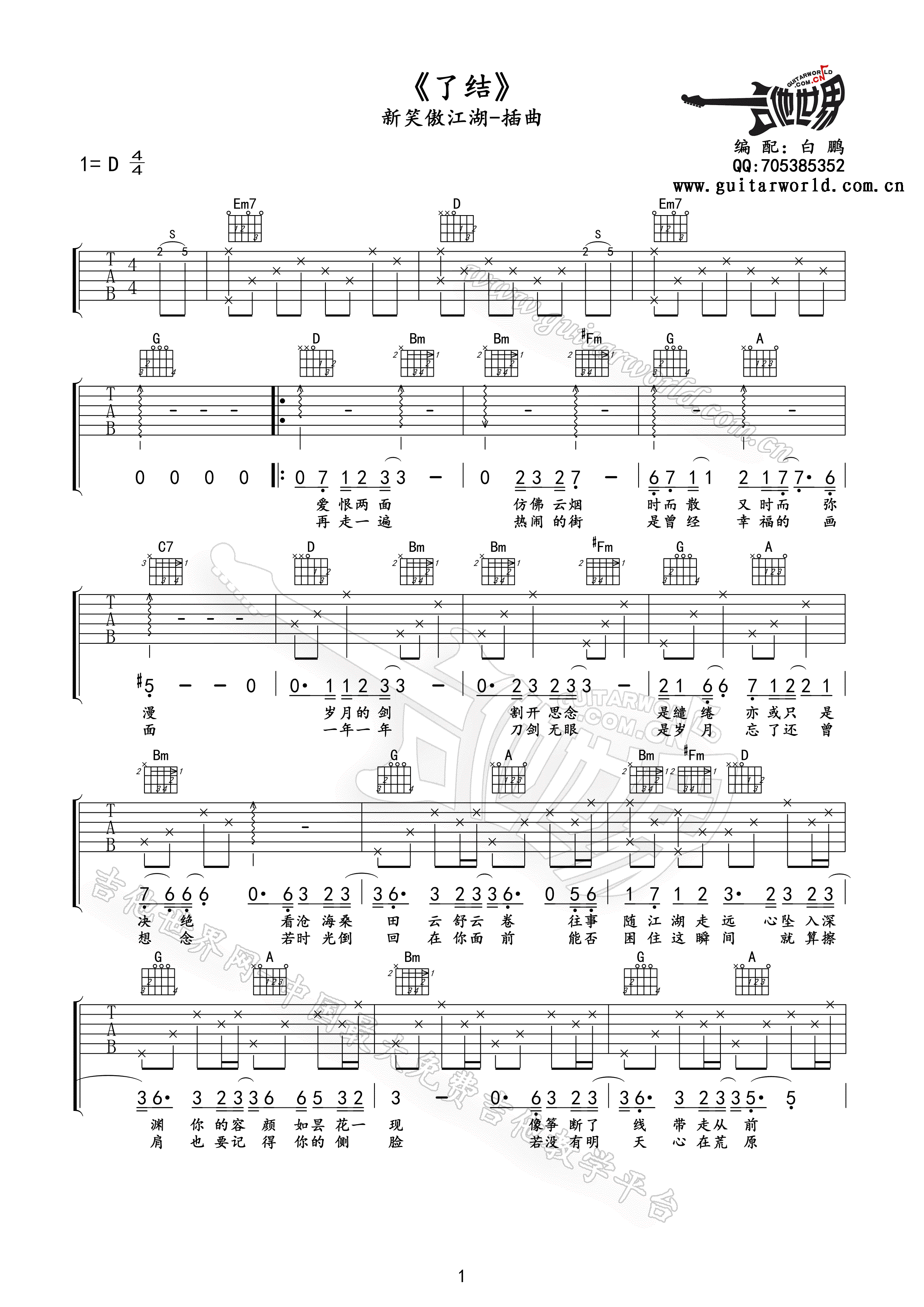 曲谱介绍: 董贞《了结》吉他弹唱谱,采用D调指法编配,吉他世界编配出品,共有2张高清图谱,免翻页排版设计。