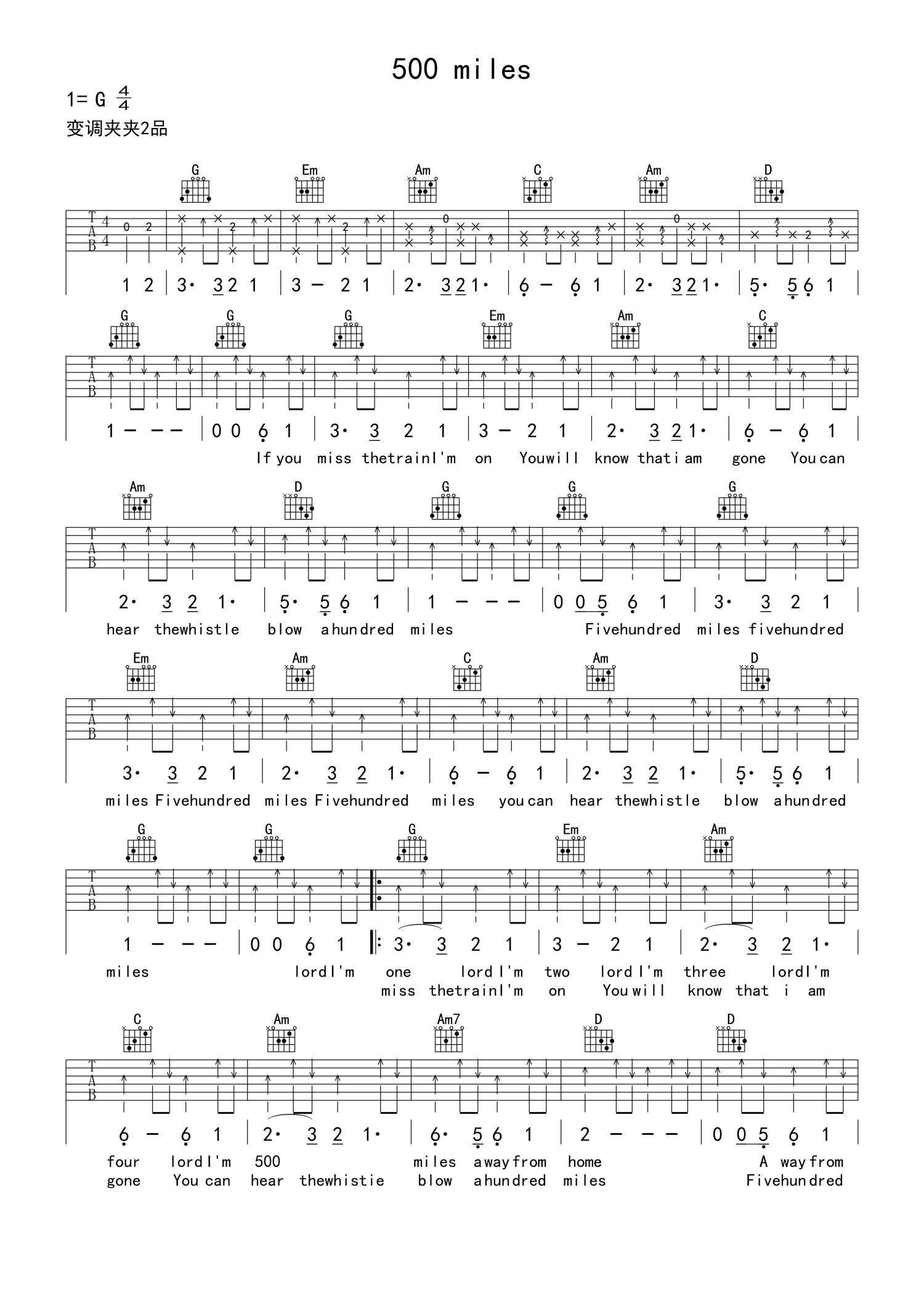 • 500 miles吉他谱 - TheBrothersFour - G调吉他弹唱谱 - 原版编配第1张