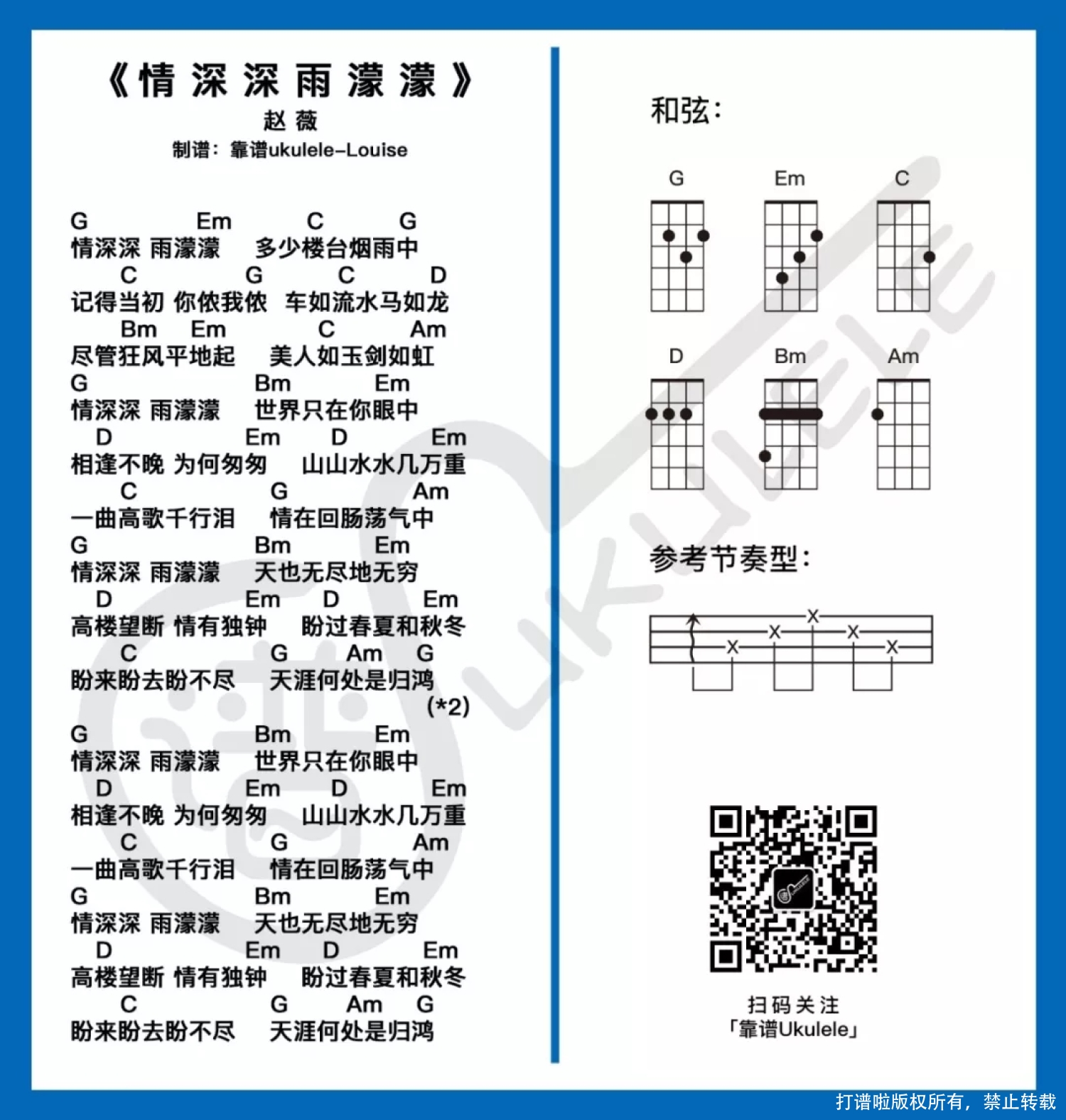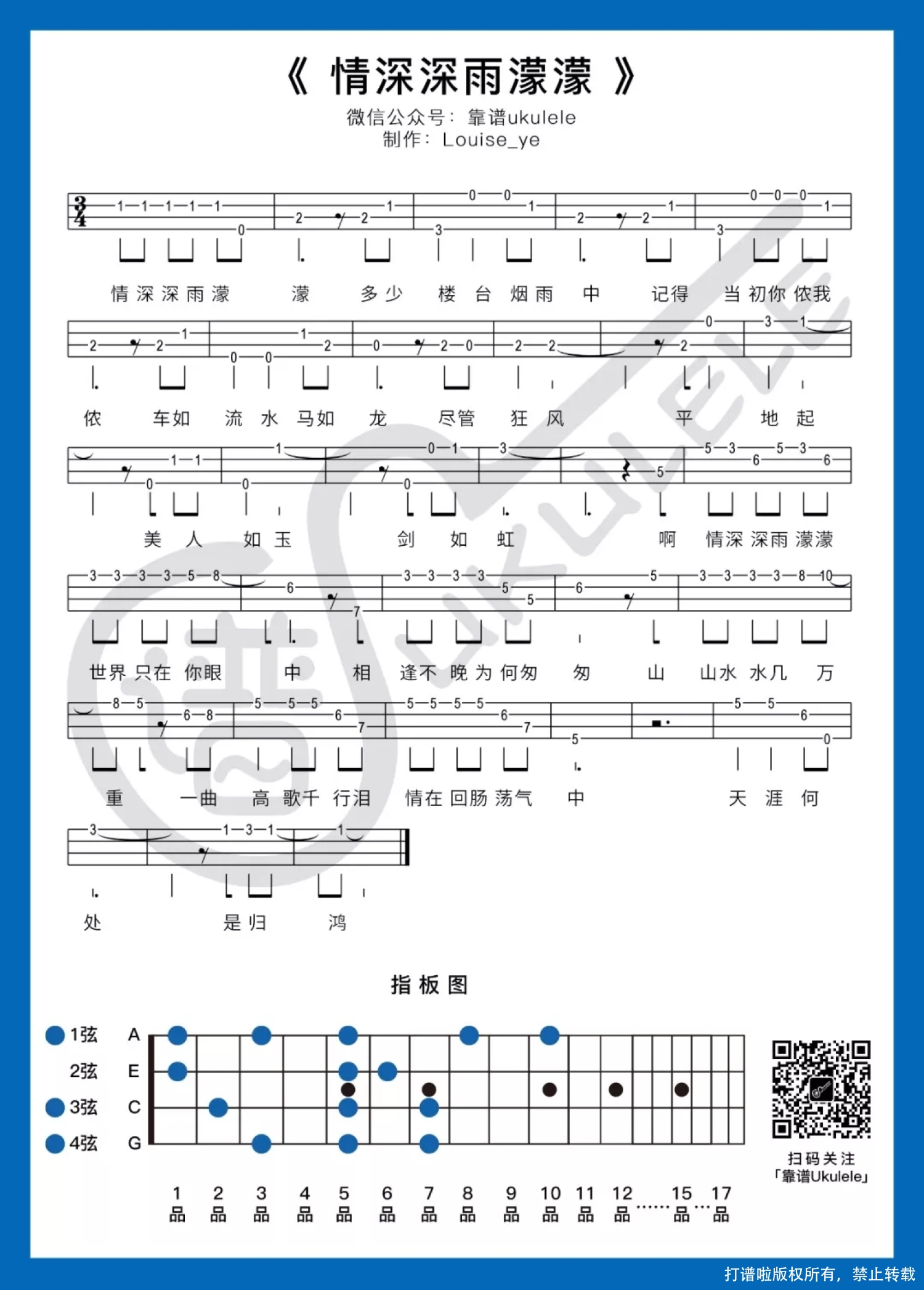 曲谱介绍: 《情深深雨濛濛》电视剧是改编自琼瑶原著小说《烟雨濛濛》,好像是《还珠格格》之后这部电视剧也小火一段时间???反正是个老片……剧情什么的是真的没什么印象。就记得这几个主角了…… 好奇一点,是最近这首歌被翻唱?还是有些朋友开始怀旧?后台收到这首歌留言的频率有点高?……先分享啦,主要这首歌也容易制作一点哈哈哈哈。 难度系数:★ 节奏型大部分和弦是弹一组,但是不绝对哦,像是“尽管狂风平地起,美人如玉剑如虹”这段中出现的Bm-Em-C-Am就分别需要弹奏两组。 一般来说给到的参考节奏型练到条件反射的状态是最好的,因为右手基本就是一个节拍一样的存在,然后+弹唱的时候只需要留意切换和弦的歌词即可。   《情深深雨濛濛》尤克里里弹唱谱   提到《情深深雨濛濛》的时候就让我忍不住想起演员王琳,她饰演的剧中雪姨表情包相信大家都不陌生…… 特别是开门的这段……真的觉得一个好的演员就是演什么是什么,演了一个泼辣的雪姨,留下了抹不去的表情包系列(σ゚∀゚)σ..:*☆…… 扯远了,扯远了哈哈哈 还是来看这次分享的单音谱吧。 ▽▽▽ 难度系数:★☆ 前半段的部分还是比较容易的,以往分享的谱四弦基本都是空弦音为主,这次分享的需要用到四弦的多了些,主要弹奏的音都集中在1品到7品之间,指法我尽量调整在每个小节比较集中在一个范围内,方便切换一些吧……(自我感觉……)。   情深深雨蒙蒙尤克里里单音指弹谱