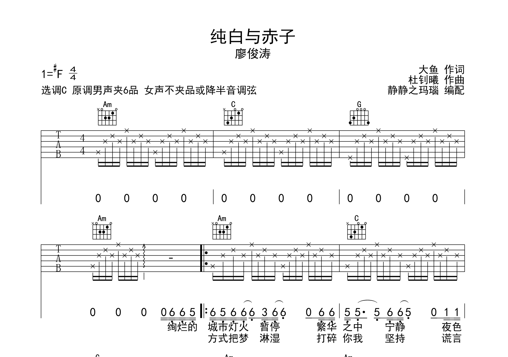 纯白与赤子吉他谱 - 廖峻涛 - C调吉他弹唱谱