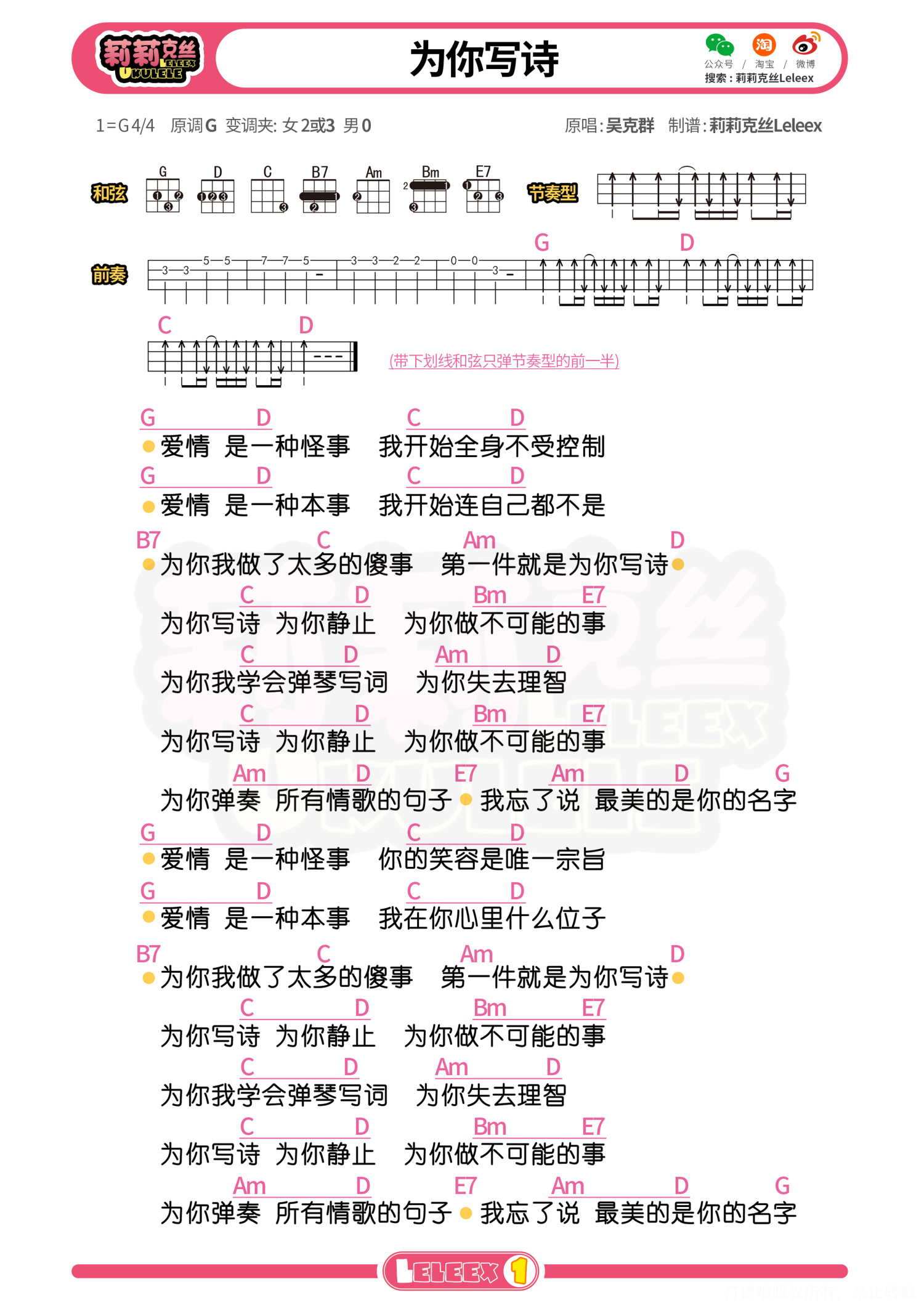 曲谱介绍: 「为你写诗」尤克里里曲谱 更多尤克里里曲谱/教学  关注@莉莉克丝Leleex
