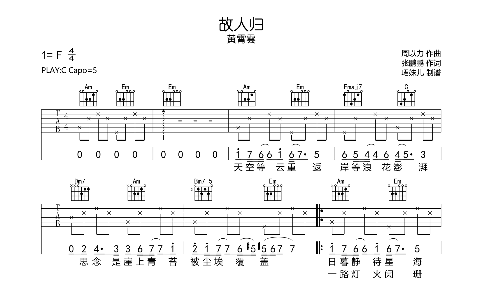 曲谱介绍: 黄霄雲《故人归》吉他谱,由珺妹儿制谱,共两张图片谱例,本谱采用C调指法编配,弹唱建议变调夹5品,速度85BPM,节奏4/4拍,难度较简单,易上手。