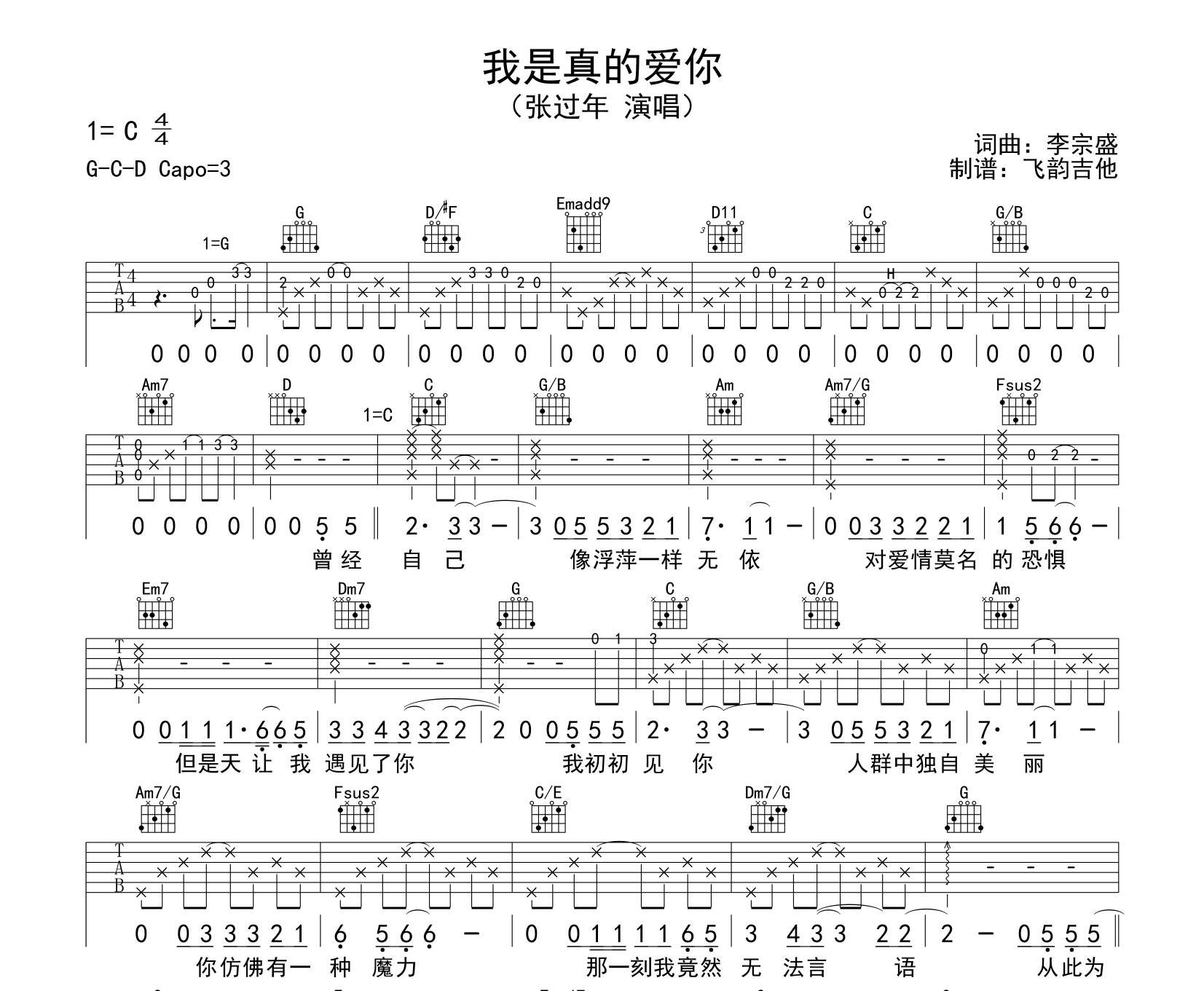 曲谱介绍: 张过年《我是真的爱你》吉他谱,由飞韵吉他制谱,共两张图片谱,选用C调指法,弹唱建议变调夹在三品位置,节奏4/4拍,难度初级简单。