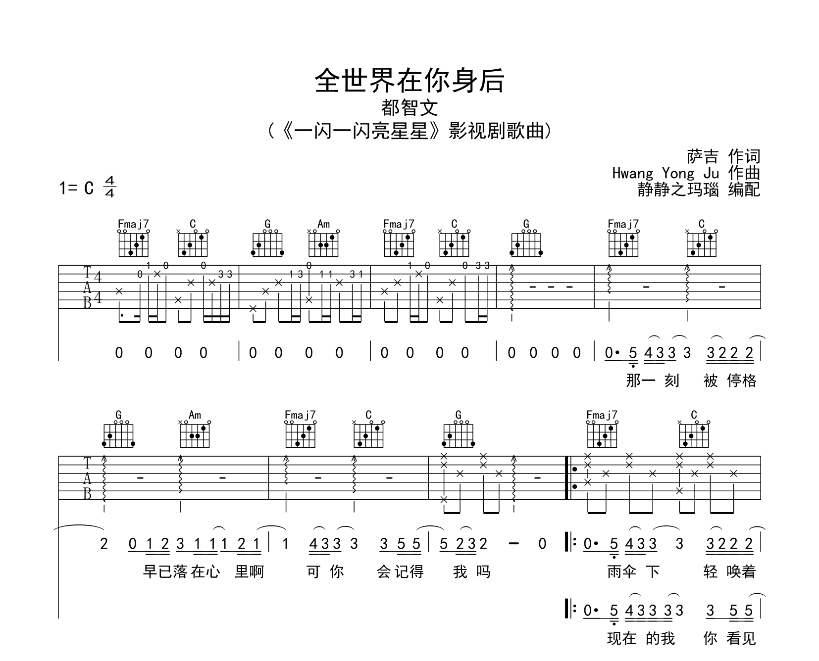 曲谱介绍: 都智文《全世界在你身后》吉他谱,由静静之玛瑙制谱,共三张高清图片谱,本谱采用C调和弦指法编配,节奏为4/4拍,速度为75拍每分钟,弹唱建议不夹变调夹,也可以根据个人嗓音找到一个舒服的位置,难度初级。