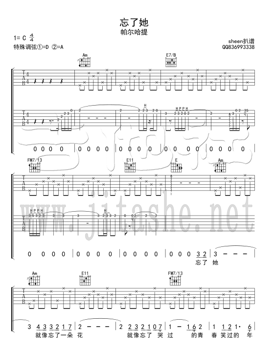 曲谱介绍: 帕尔哈提《忘了他》吉他弹唱谱,采用C调指法编配,吉他社编配出品,共有5张高清图谱。