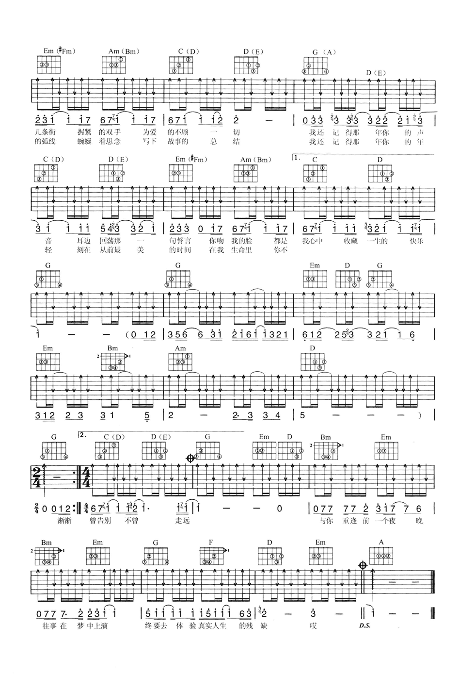曲谱介绍: 梁静茹《我还记得》吉他弹唱谱,采用G调指法编配,共有2张高清图谱,免翻页排版设计。