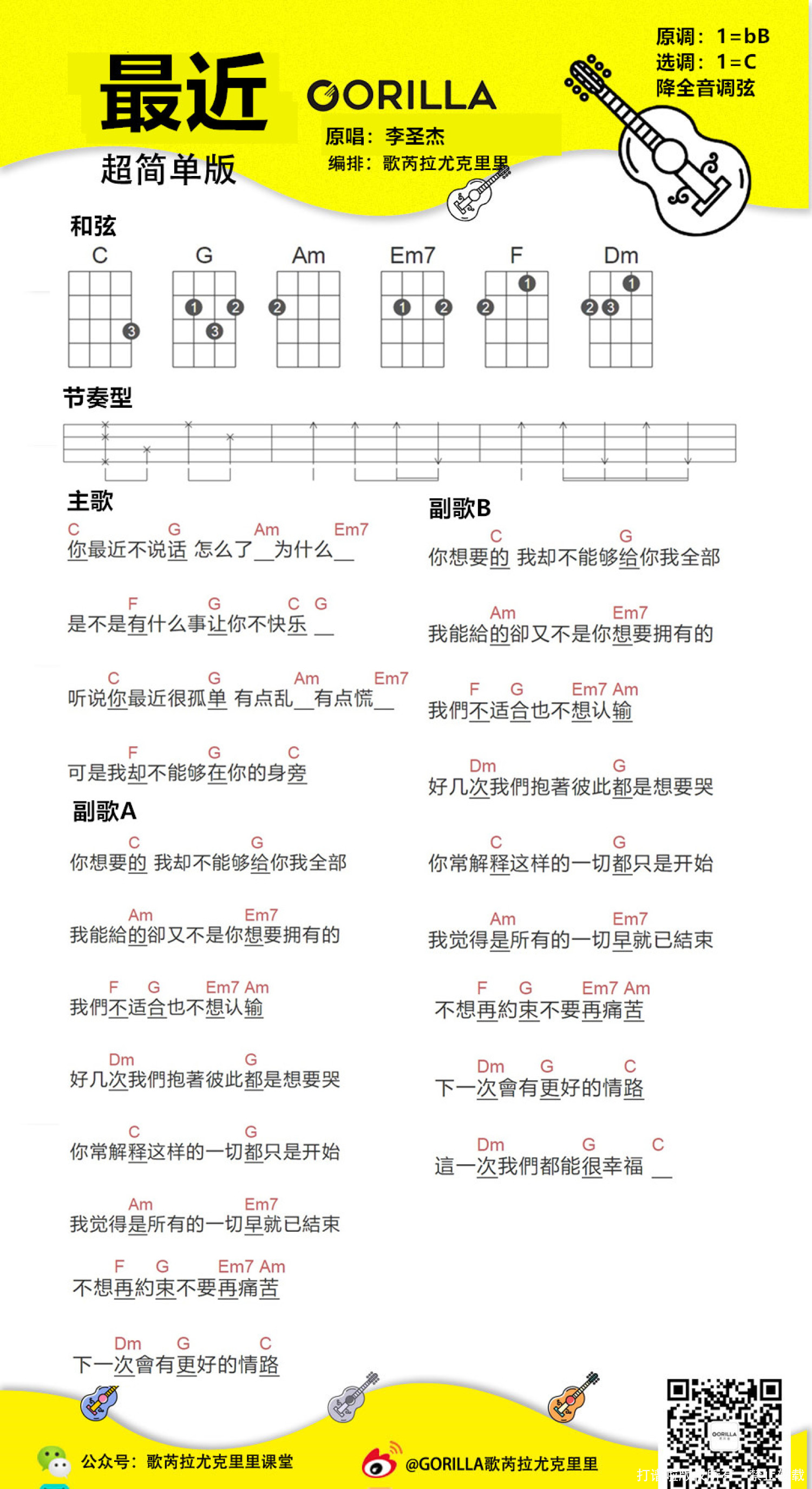 曲谱介绍: 《最近》李圣杰演唱的歌曲,收录于专辑《关于你的歌》中。近来,这首歌因抖音上一个男生在厕所用吉他翻唱而唱火。 下面我们就一起来学习一下这首歌的简单版最近尤克里里弹唱吧! 下面给大家附上 最近 弹唱谱:
