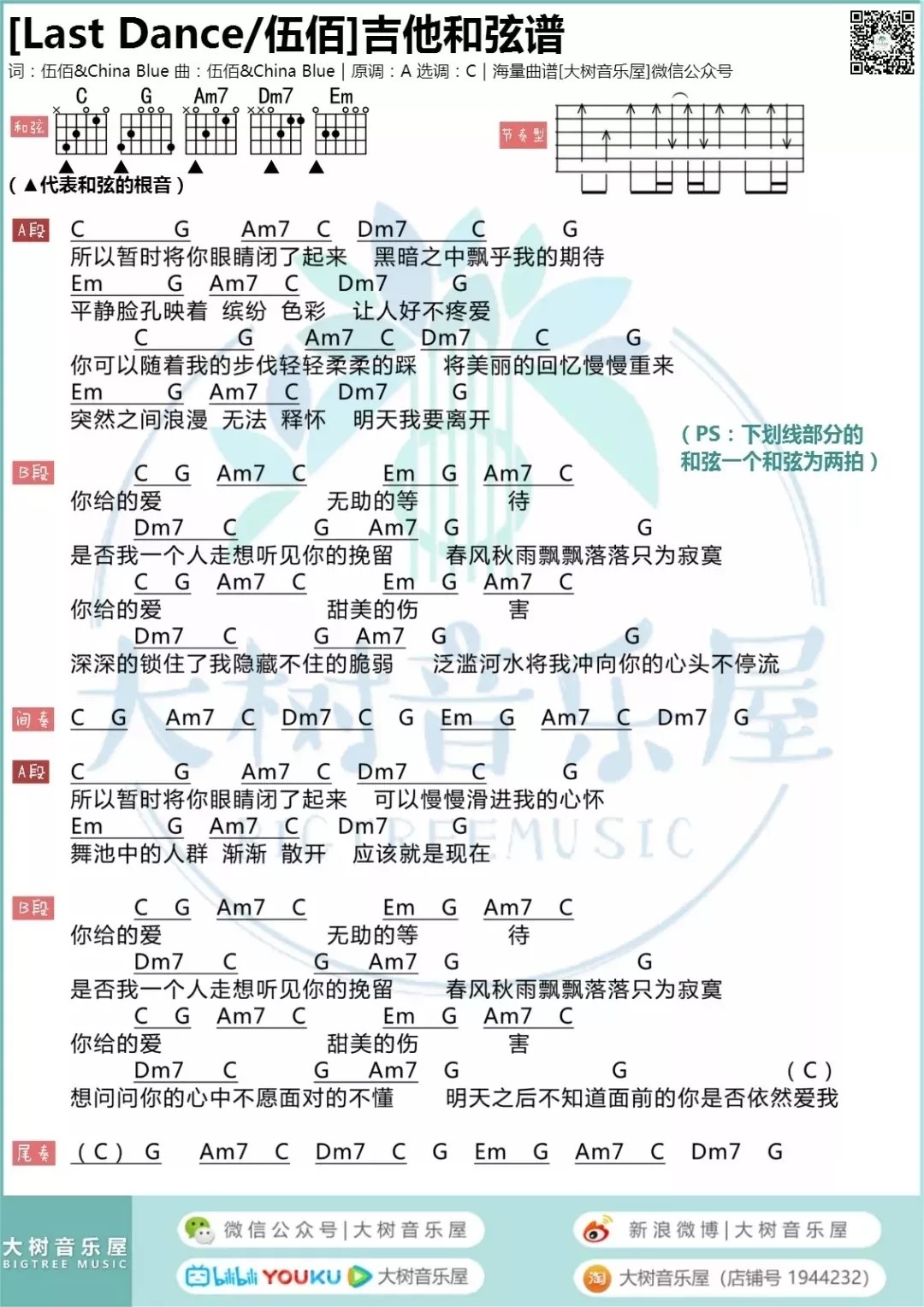 曲谱介绍: Last《LastDance》吉他弹唱谱,采用C调指法编配,大树音乐屋编配出品,共有4张高清图谱。