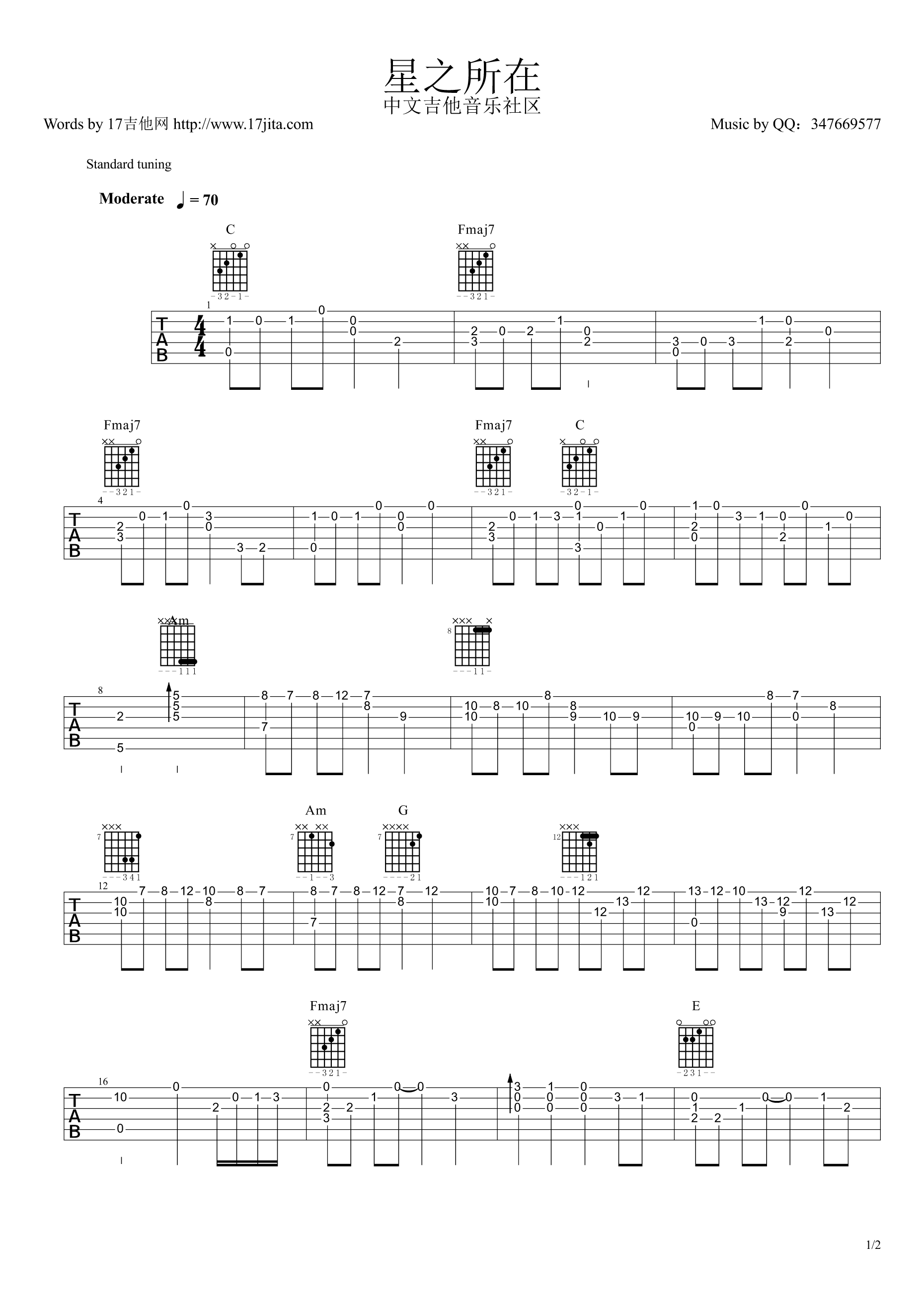 曲谱介绍: 海楠《星之所在》吉他独奏谱,采用C调指法编配,17吉他编配出品,共有2张高清图谱,免翻页排版设计。
