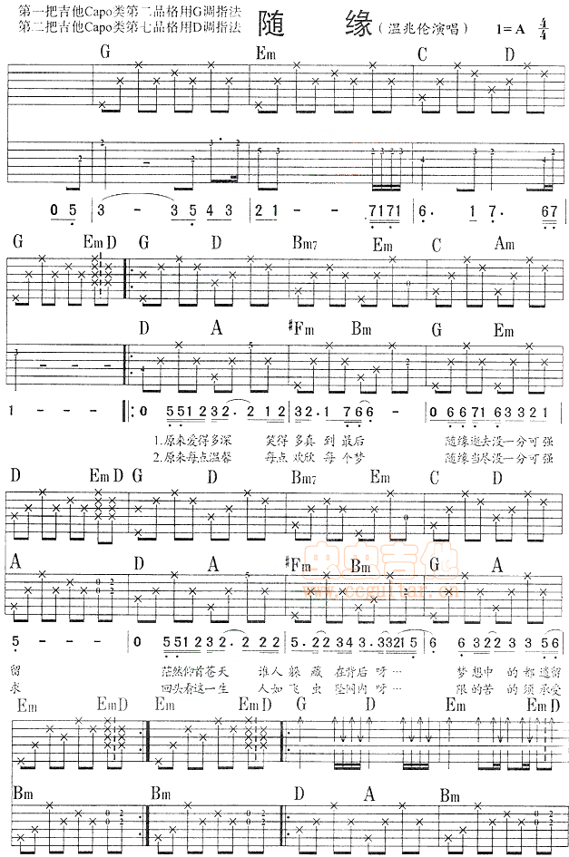 曲谱介绍: 温兆伦《随缘》吉他弹唱谱,采用A调指法编配,共有2张高清图谱,免翻页排版设计。