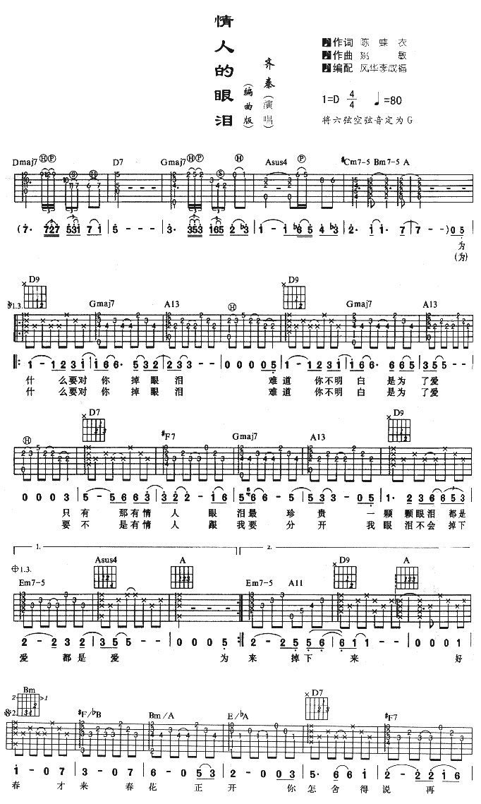 曲谱介绍: 齐秦《情人的眼泪》吉他弹唱谱,采用D调指法编配,风华李成福编配出品,共有2张高清图谱,免翻页排版设计。