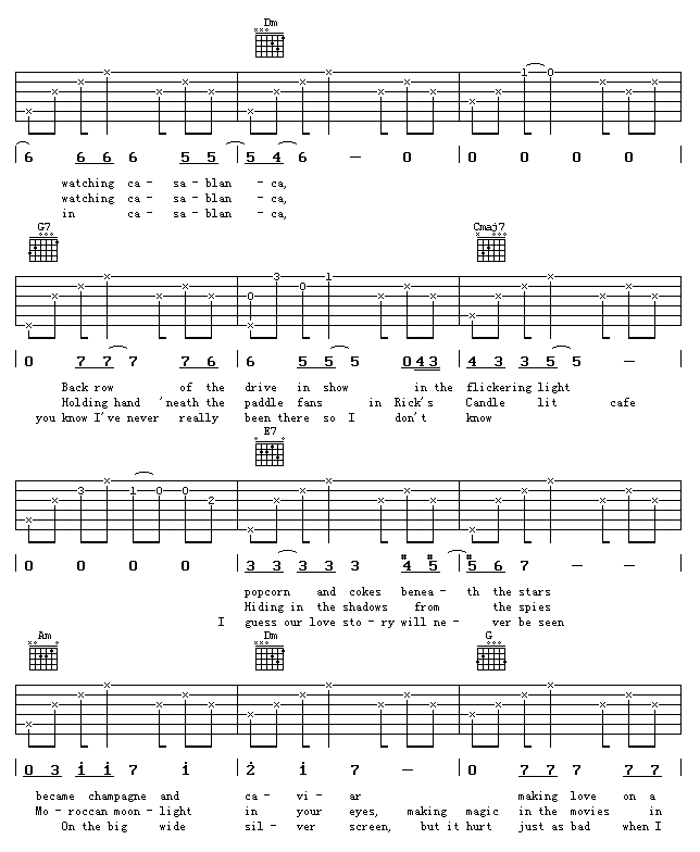 曲谱介绍: 贝蒂·希金斯《卡萨布兰卡》吉他弹唱谱,采用A调指法编配,17吉他编配出品,共有5张高清图谱。