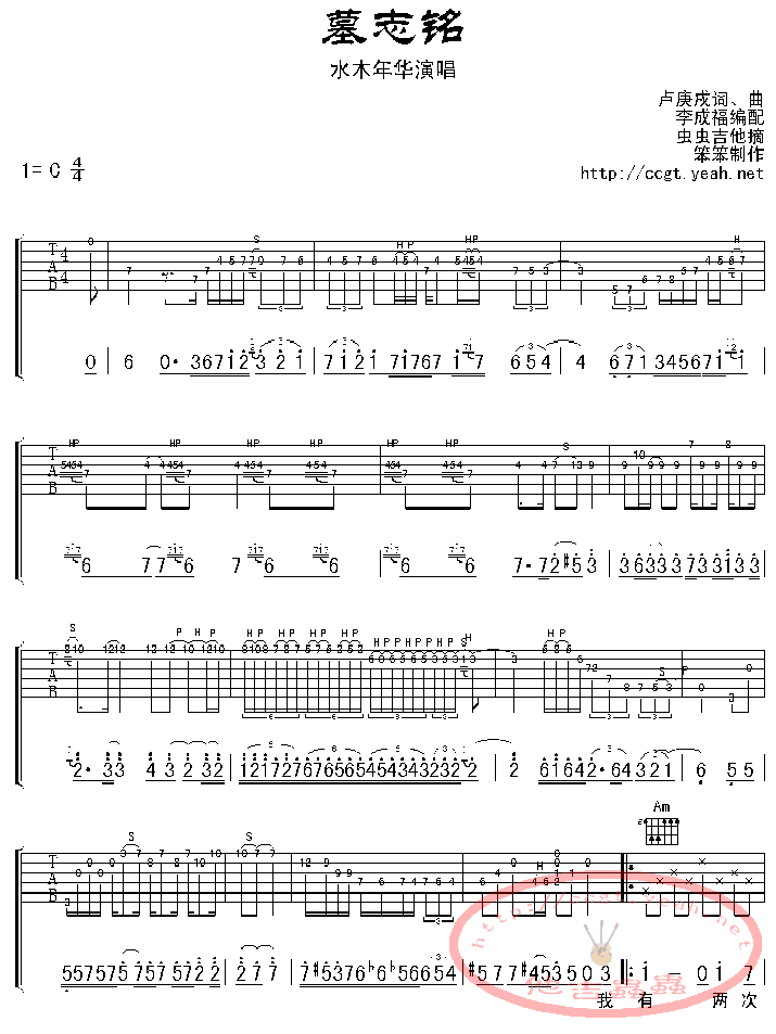 曲谱介绍: 水木年华《墓志铭》吉他弹唱谱,采用C调指法编配,虫虫吉他编配出品,共有3张高清图谱。
