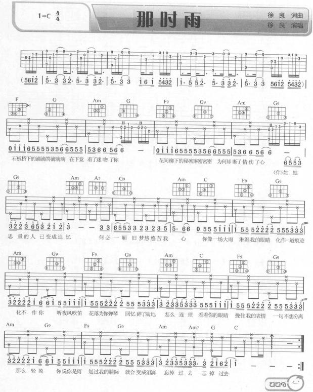 曲谱介绍: 徐良《那时雨》吉他弹唱谱,采用C调指法编配,共有1张高清图谱,免翻页排版设计。