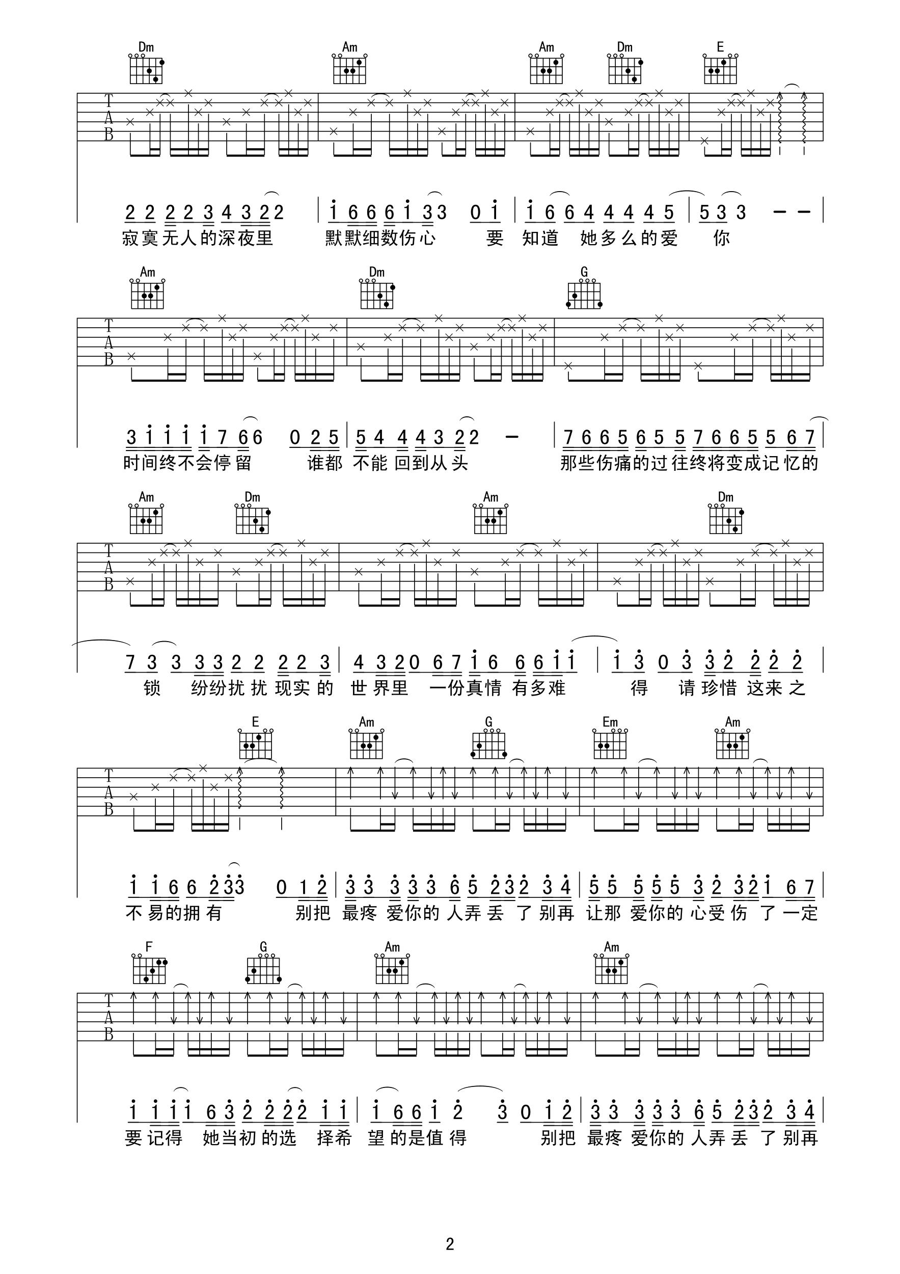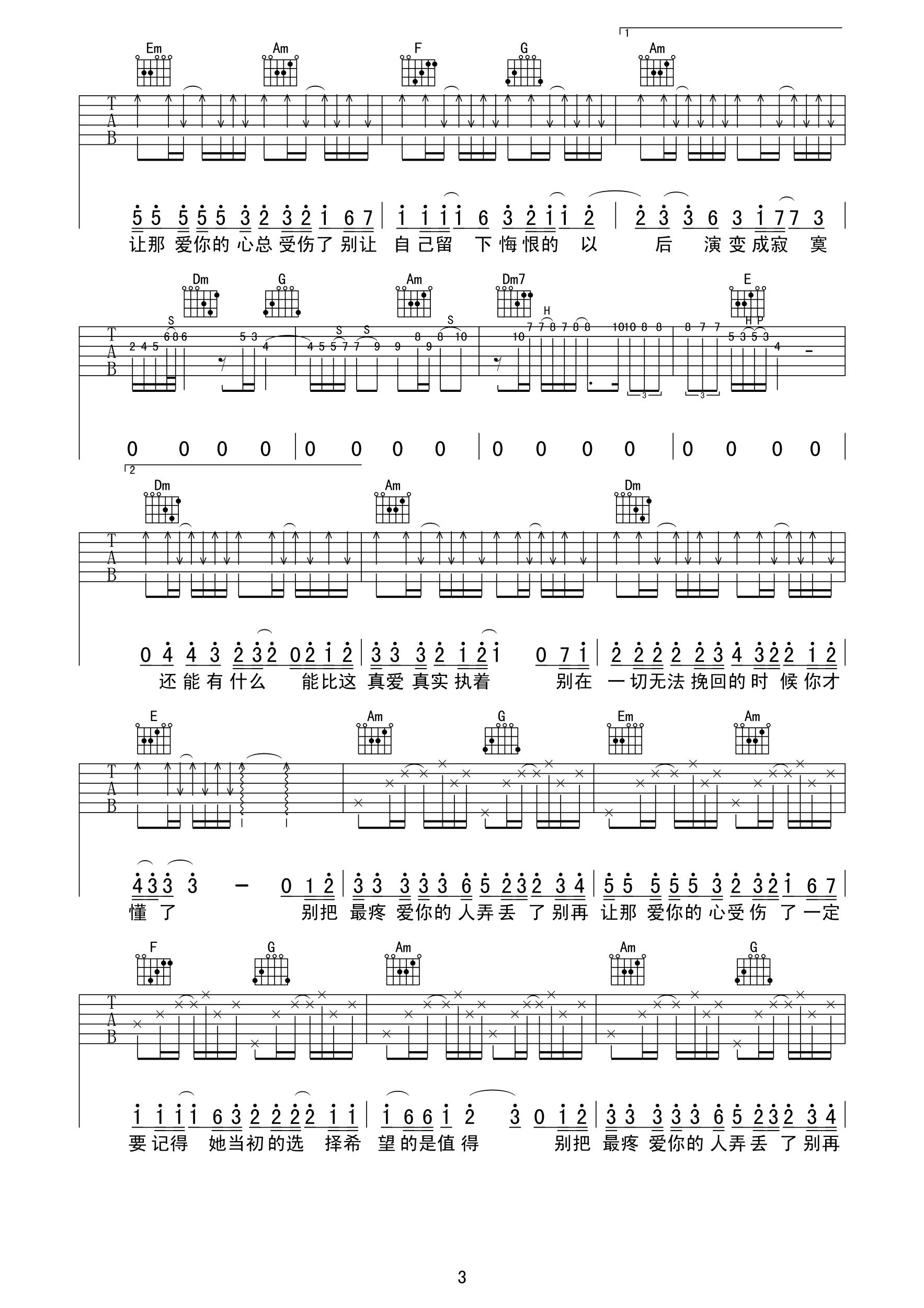 曲谱介绍: 雨宗林《别把疼你的人弄丢了》吉他弹唱谱,采用C调指法编配,任光辉编配出品,共有4张高清图谱。