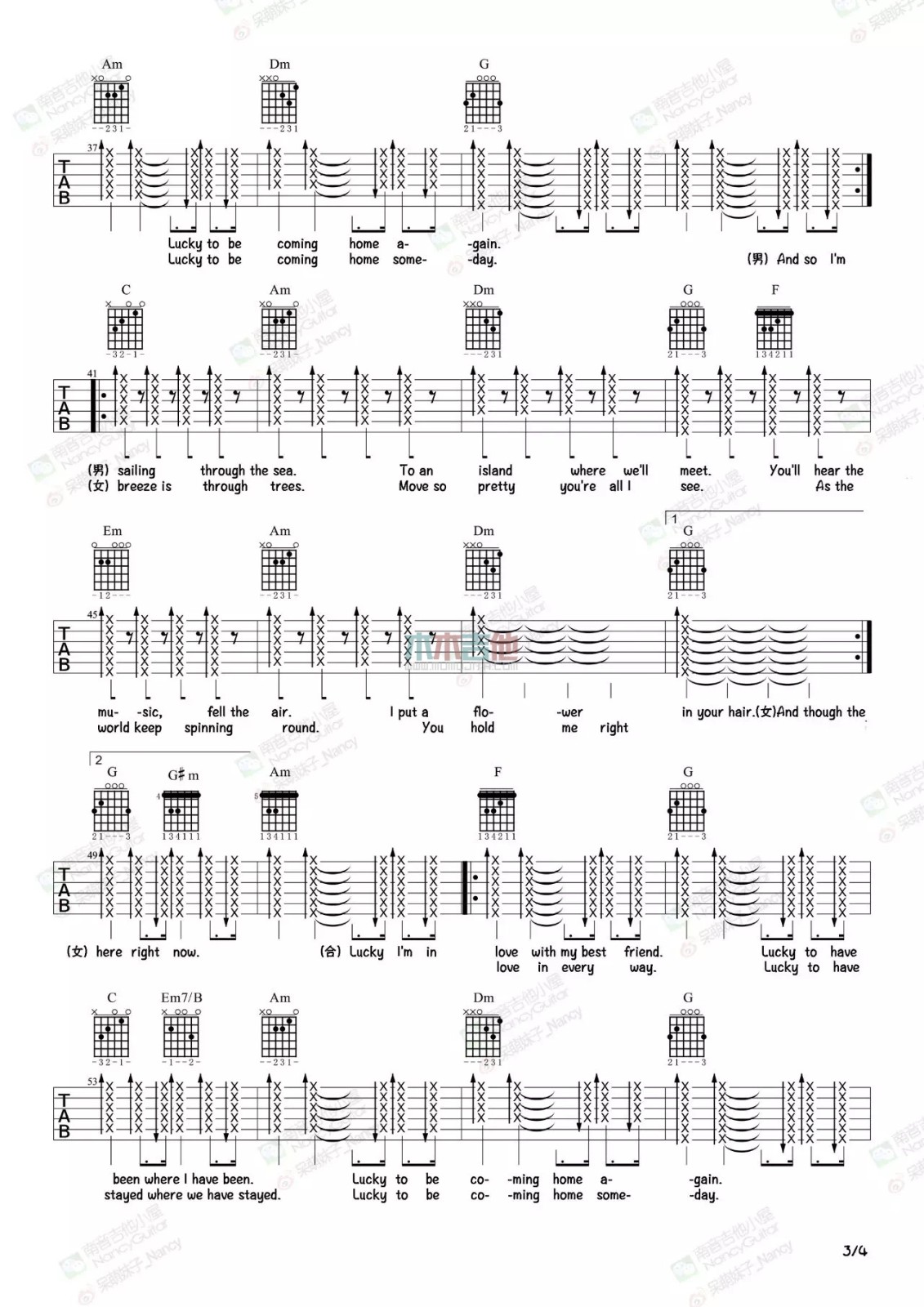 曲谱介绍: Jason《lucky》吉他弹唱谱,采用C调指法编配,木木吉他编配出品,共有4张高清图谱。