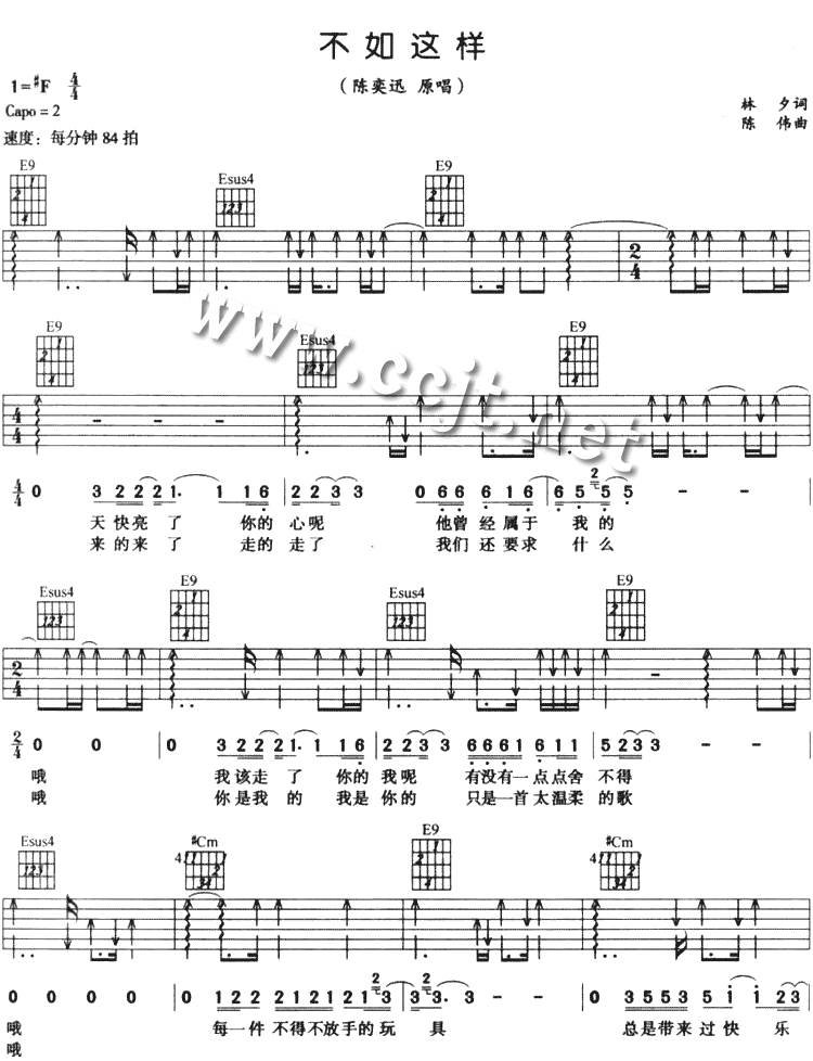 曲谱介绍: 陈奕迅《不如这样》吉他弹唱谱,采用F调指法编配,共有2张高清图谱,免翻页排版设计。
