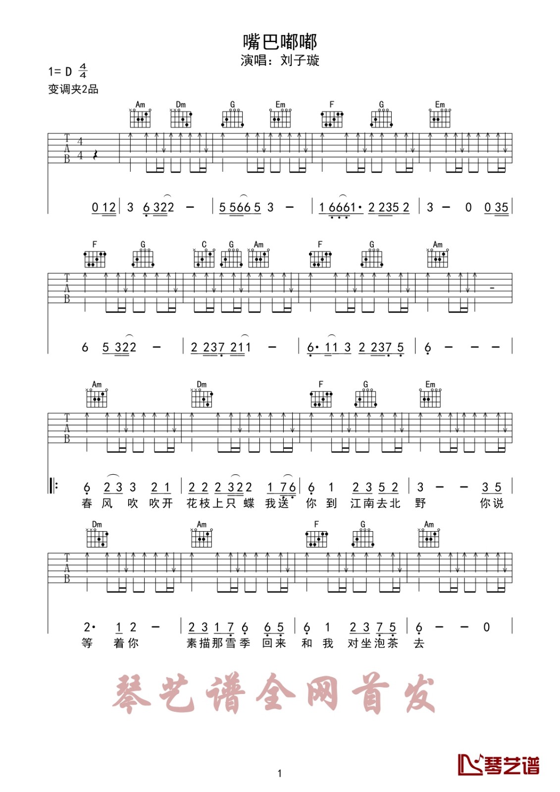 曲谱介绍: 刘子璇《嘴巴嘟嘟》吉他弹唱谱,采用D调指法编配,琴艺谱编配出品,共有3张高清图谱。