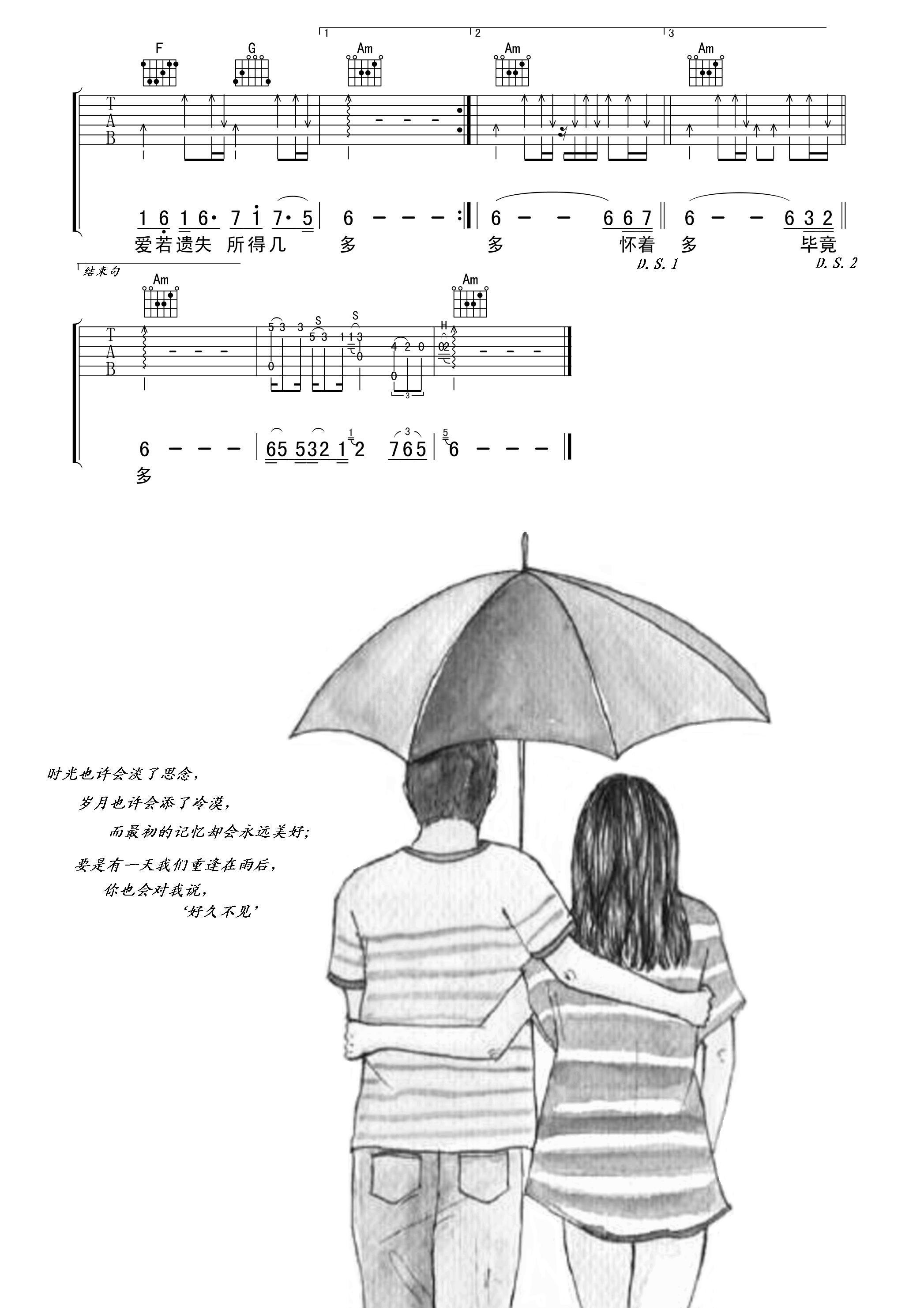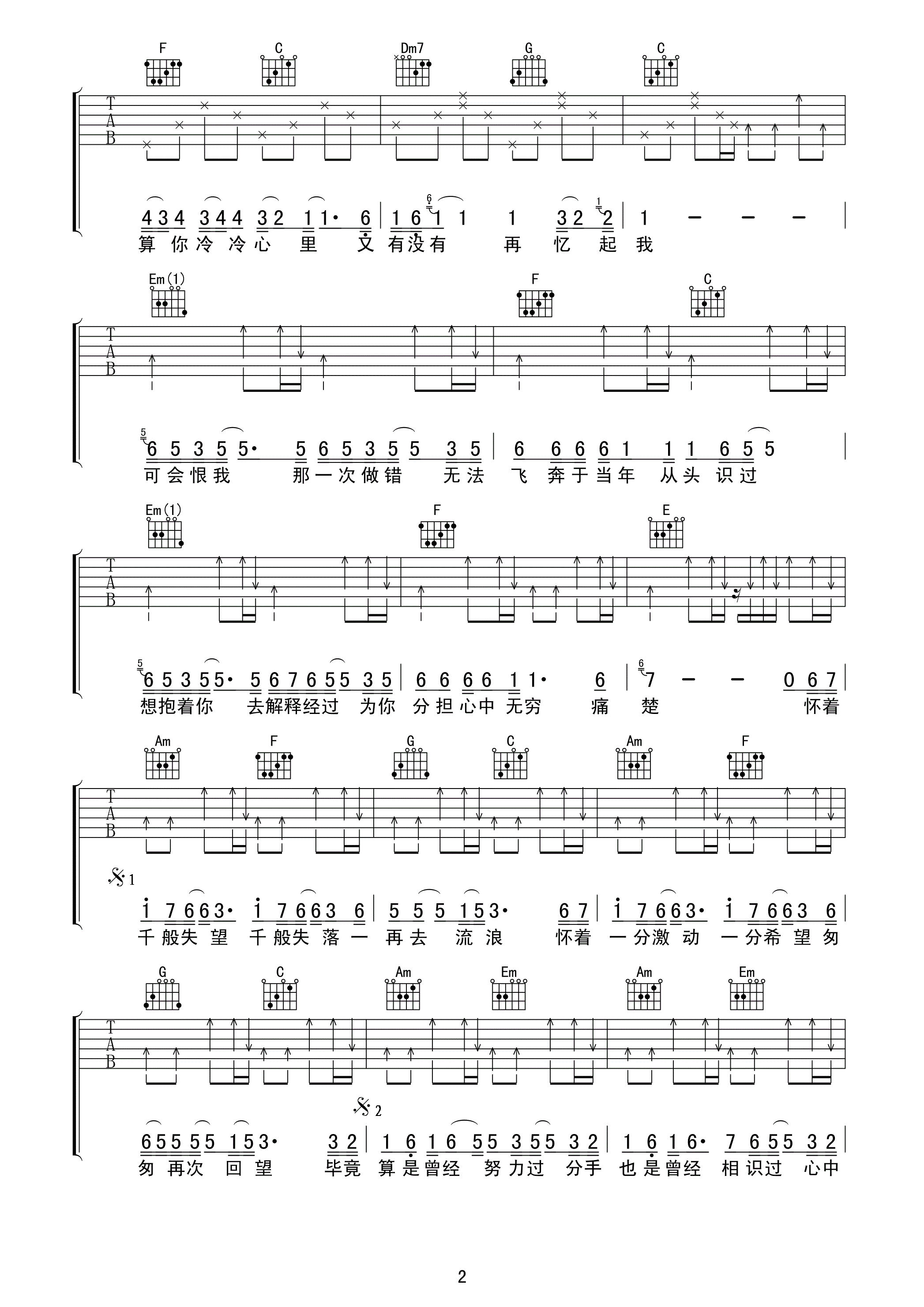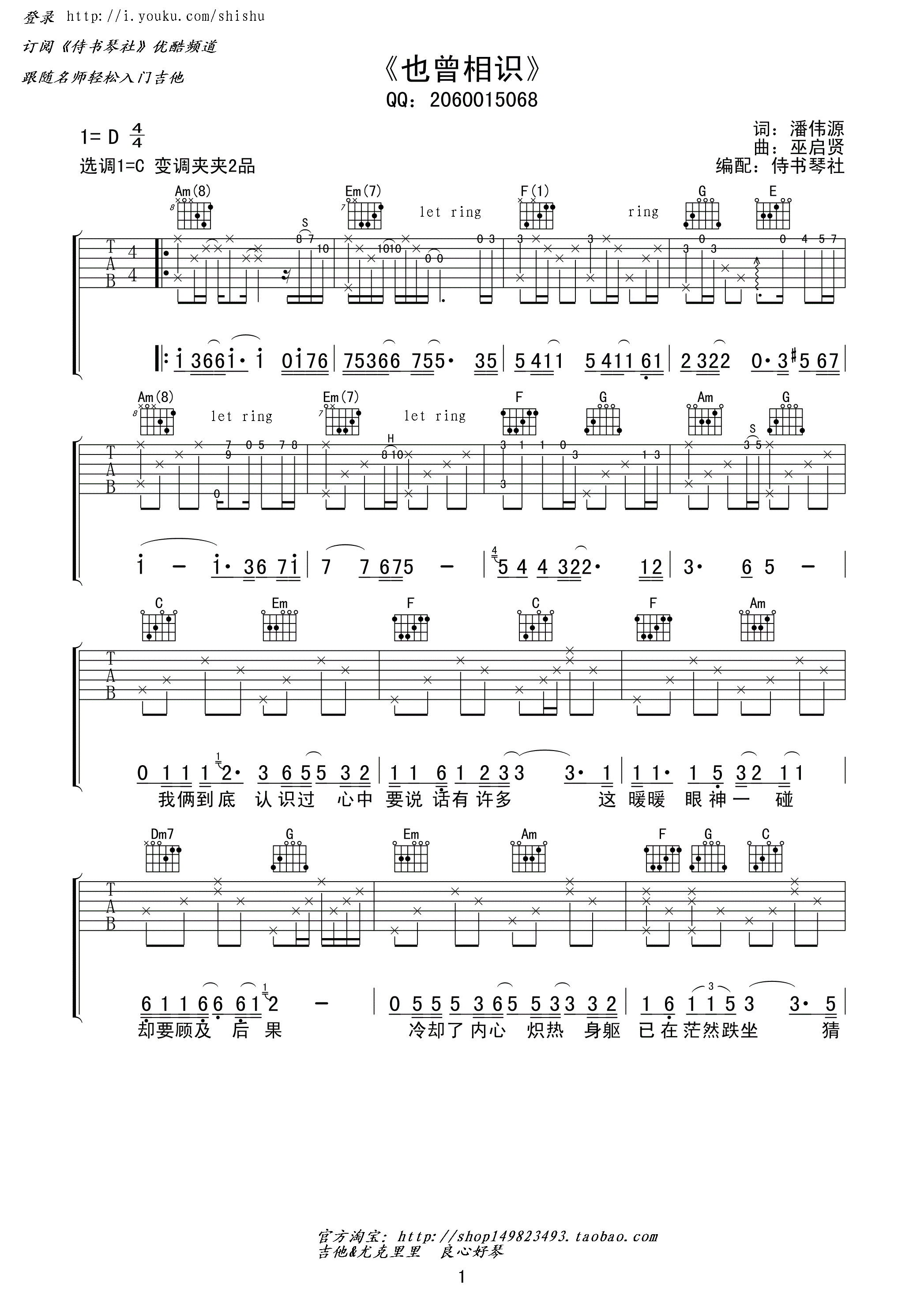 曲谱介绍: 谭咏麟《也曾相识》吉他弹唱谱,采用C调指法编配,待书琴社编配出品,共有3张高清图谱。