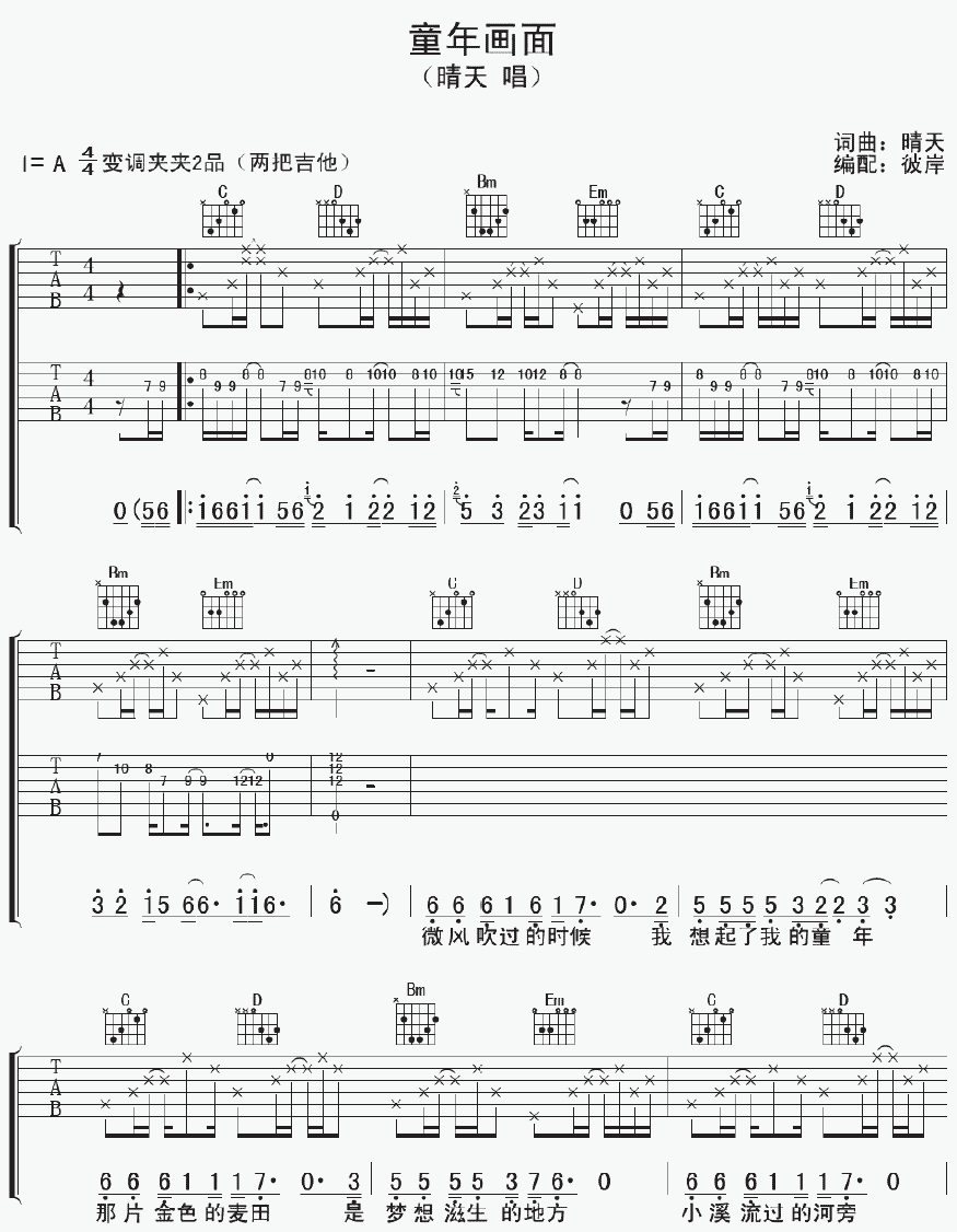 曲谱介绍: 晴天《童年画面》吉他弹唱谱,采用A调指法编配,彼岸吉他编配出品,共有3张高清图谱。