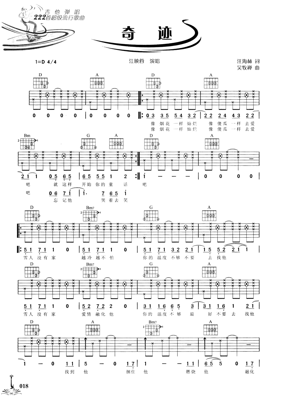曲谱介绍: 江映蓉《奇迹》吉他弹唱谱,采用D调指法编配,共有2张高清图谱,免翻页排版设计。