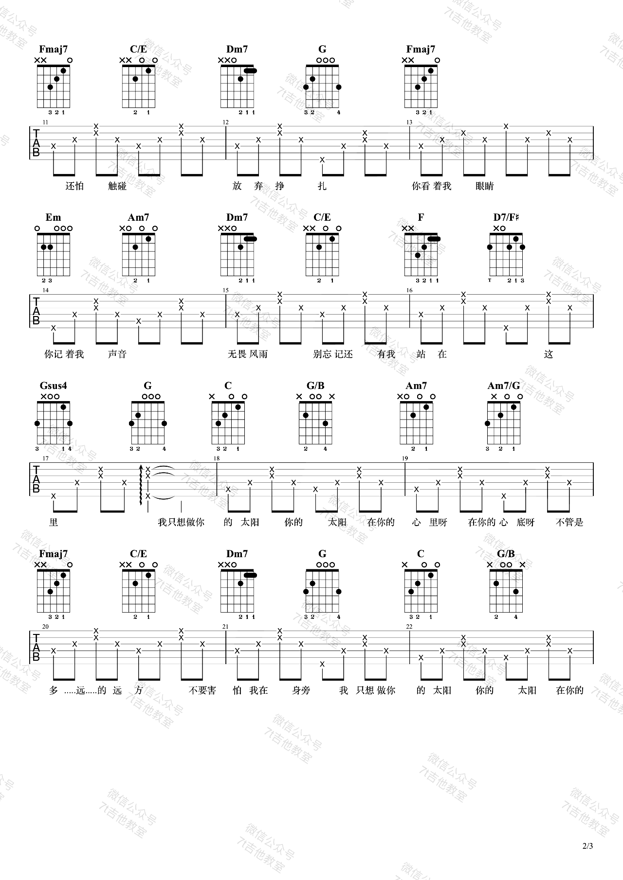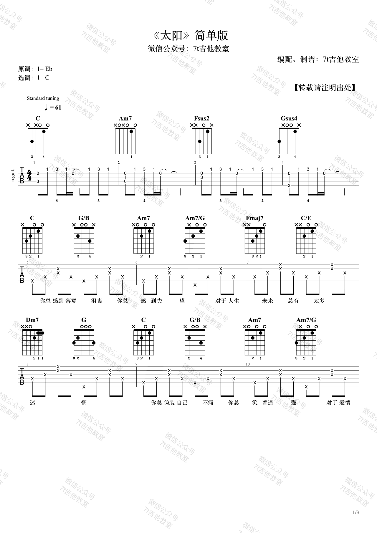 曲谱介绍: 邱振哲《太阳》吉他弹唱谱,采用C调指法编配,7t吉他教室编配出品,共有3张高清图谱。