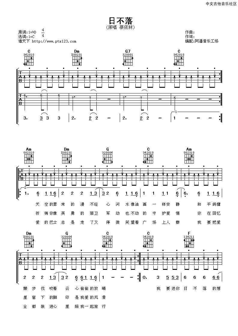 曲谱介绍: 蔡依林《日不落》吉他弹唱谱,采用C调指法编配,阿潘音乐工场编配出品,共有2张高清图谱,免翻页排版设计。