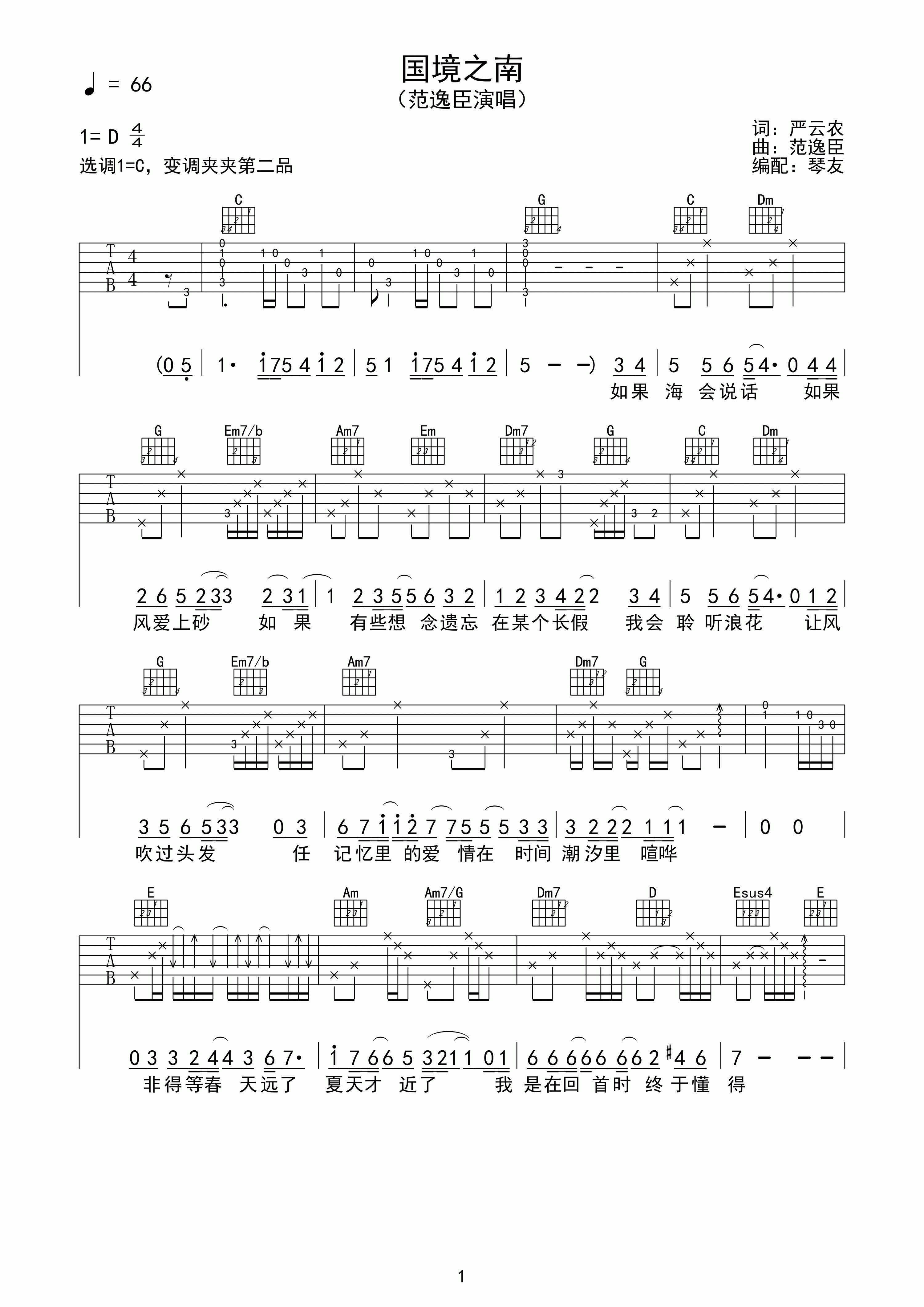 曲谱介绍: 附前奏《国境之南》吉他弹唱谱,采用C调指法编配,共有3张高清图谱。