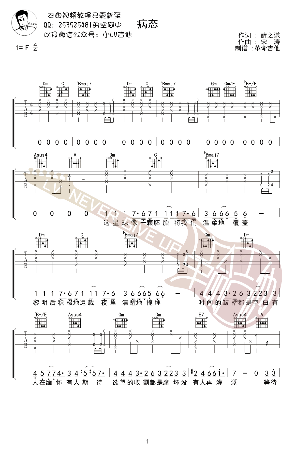 曲谱介绍: 薛之谦《病态》吉他弹唱谱,采用F调指法编配,革命吉他编配出品,共有4张高清图谱。