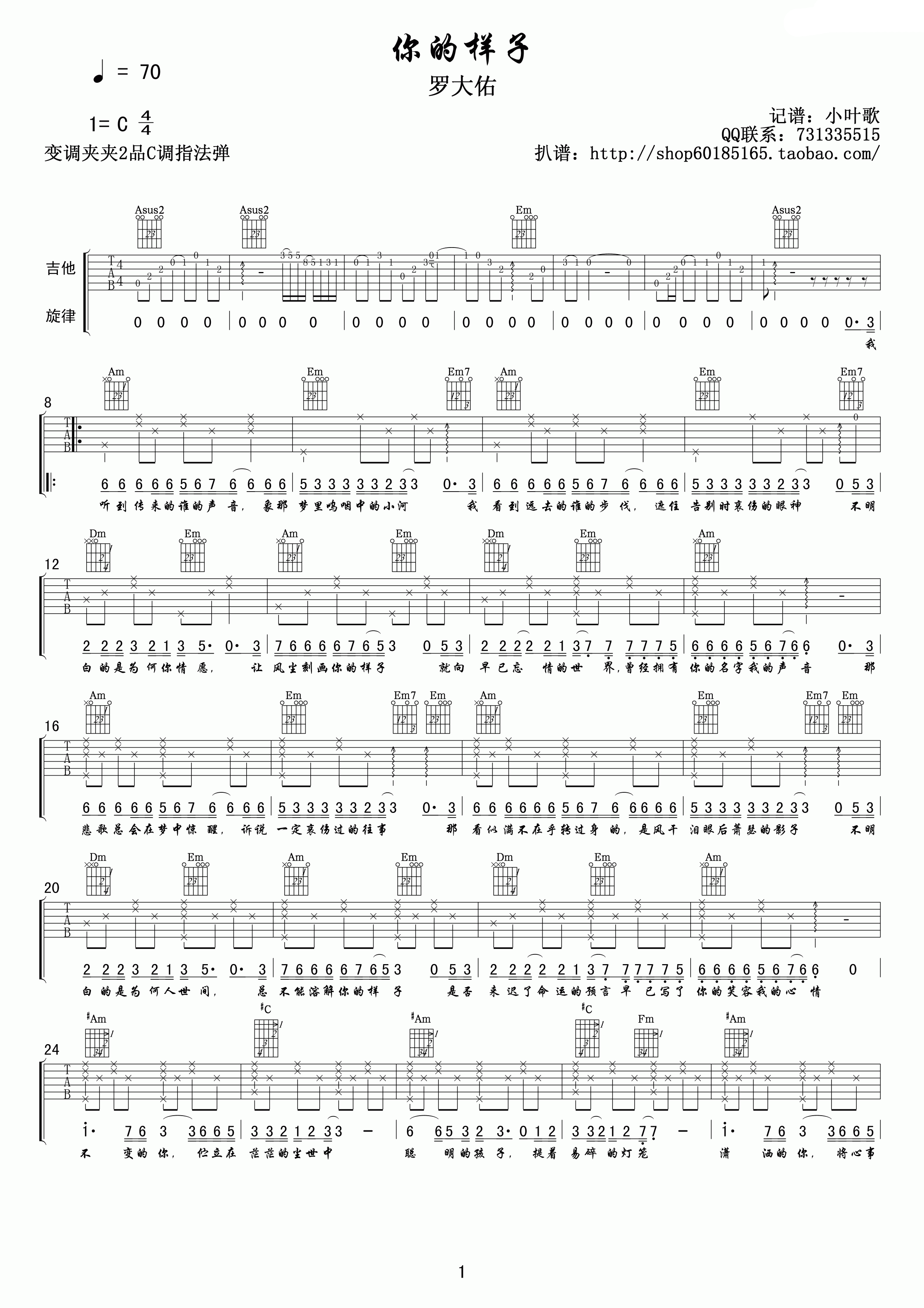 曲谱介绍: 罗大佑《你的样子》吉他弹唱谱,采用C调指法编配,小叶歌吉他编配出品,共有2张高清图谱,免翻页排版设计。