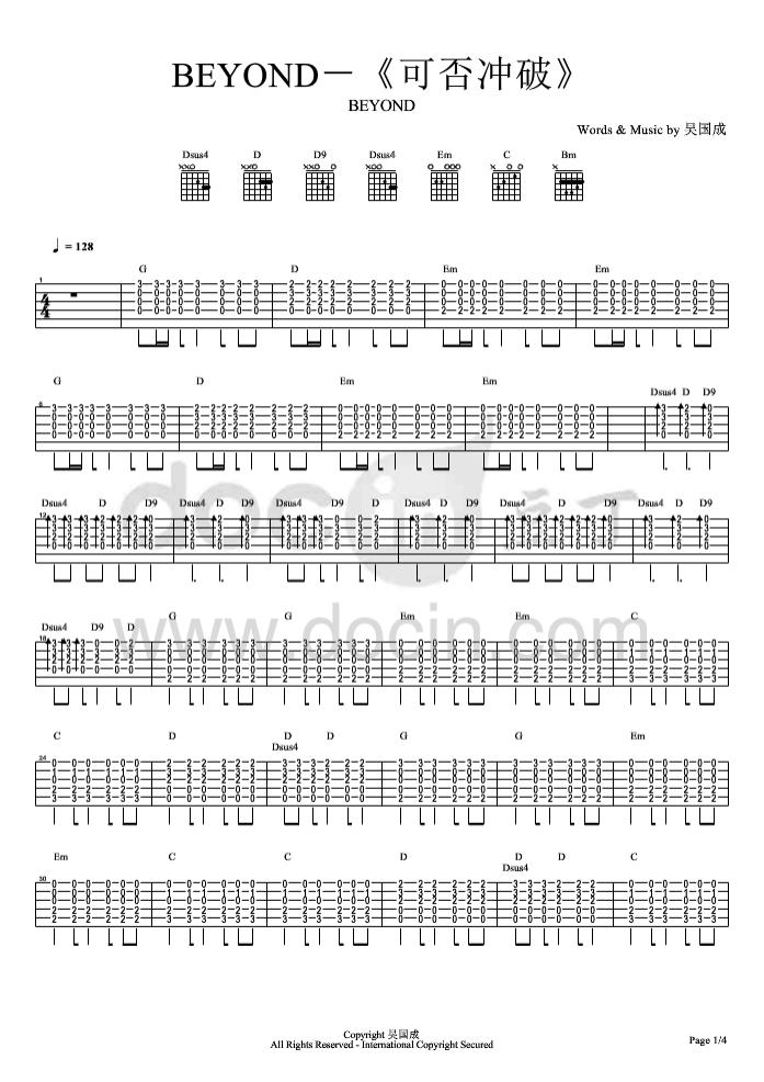 曲谱介绍: BEYOND《可否冲破》吉他独奏谱,豆丁网编配出品,共有4张高清图谱。