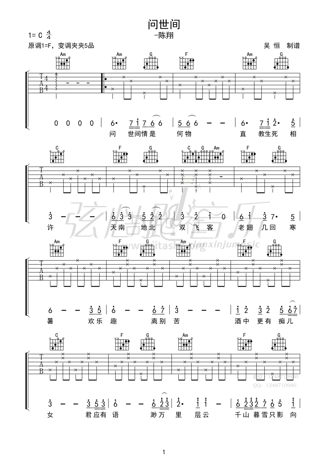 曲谱介绍: 陈翔《问世间》吉他弹唱谱,采用C调指法编配,弦心跳编配出品,共有2张高清图谱,免翻页排版设计。