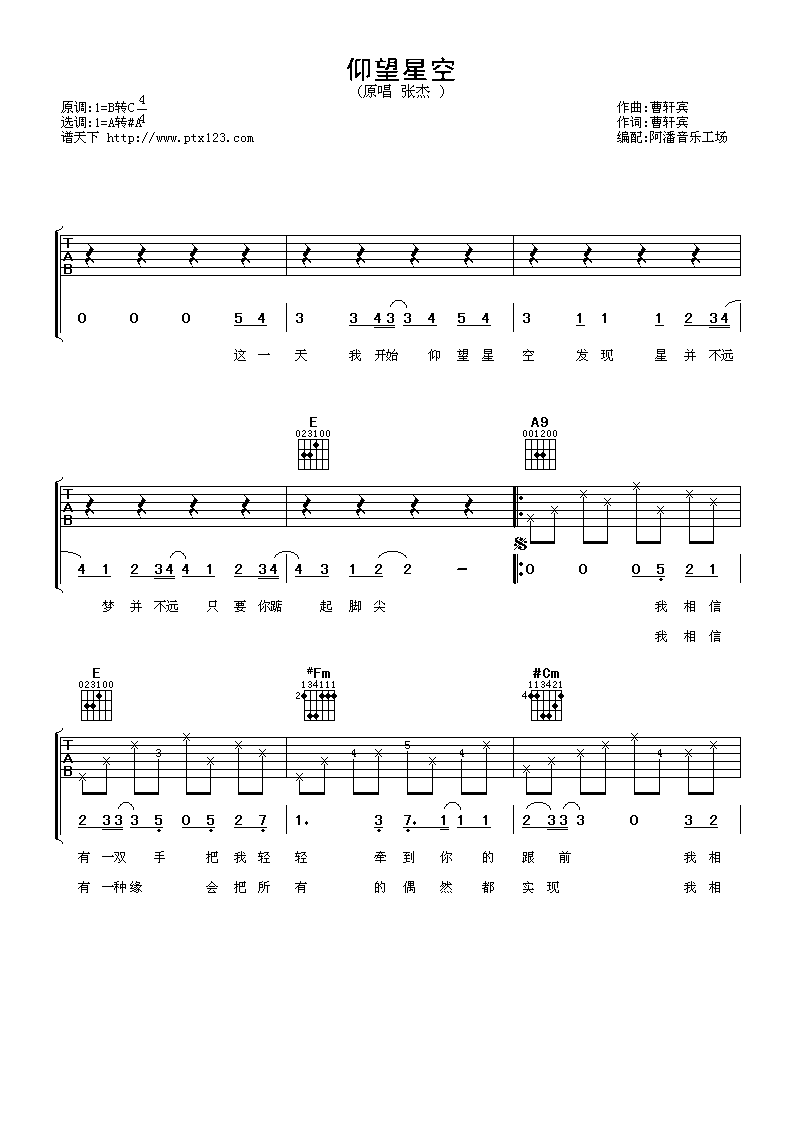 曲谱介绍: 张杰《仰望星空》吉他弹唱谱,采用A调指法编配,阿潘音乐工场编配出品,共有3张高清图谱。
