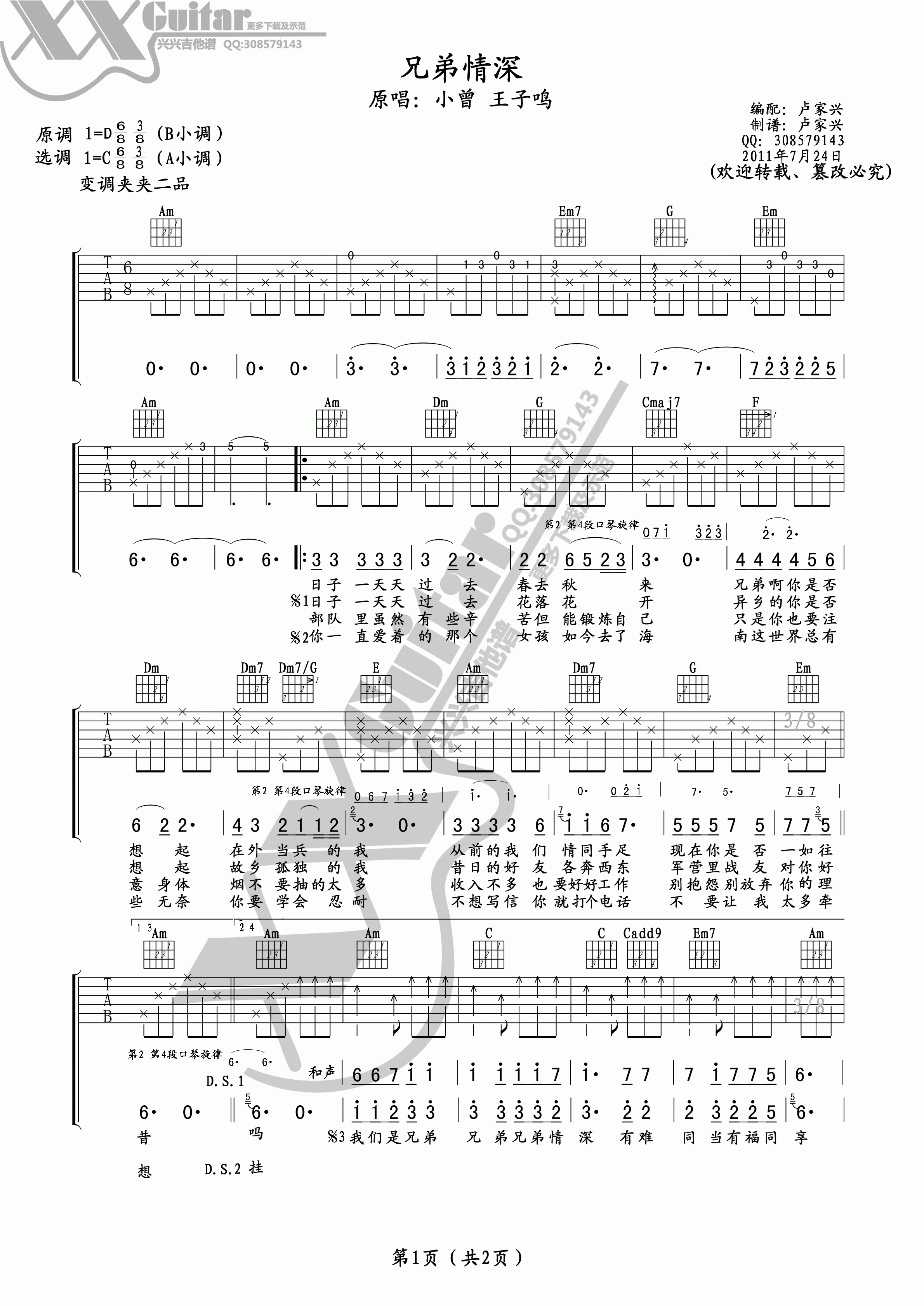 曲谱介绍: 小曾《兄弟情深》吉他弹唱谱,采用C调指法编配,卢家兴编配出品,共有2张高清图谱,免翻页排版设计。