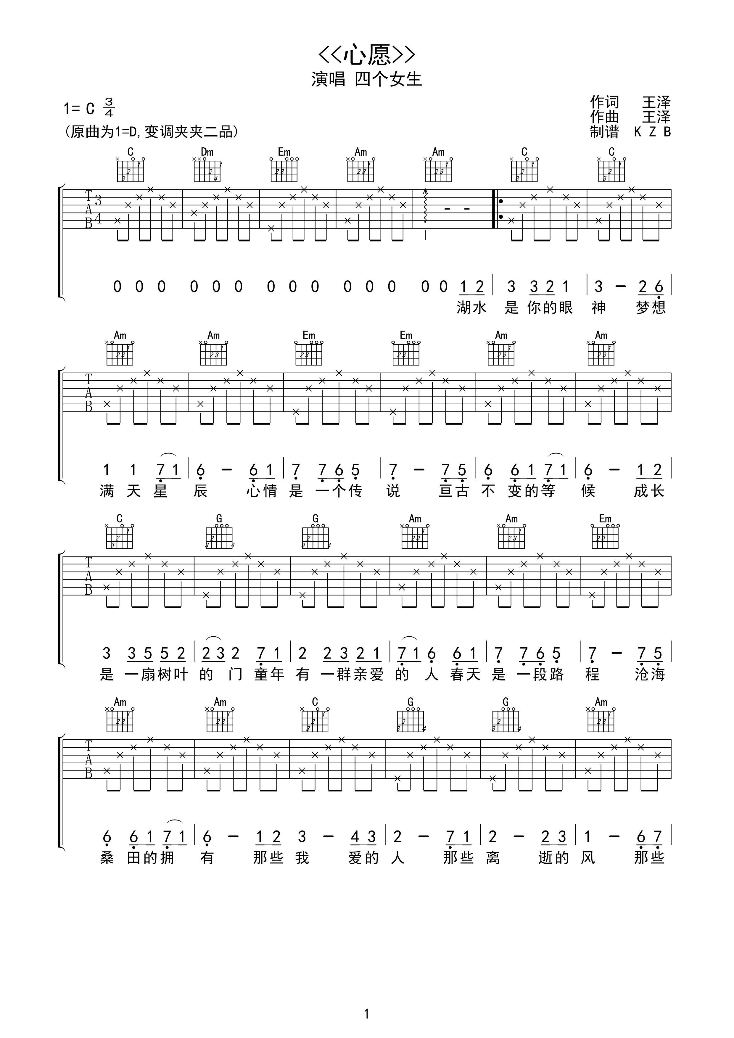 曲谱介绍: 四个女生《星愿》吉他弹唱谱,采用C调指法编配,MZB编配出品,共有3张高清图谱。