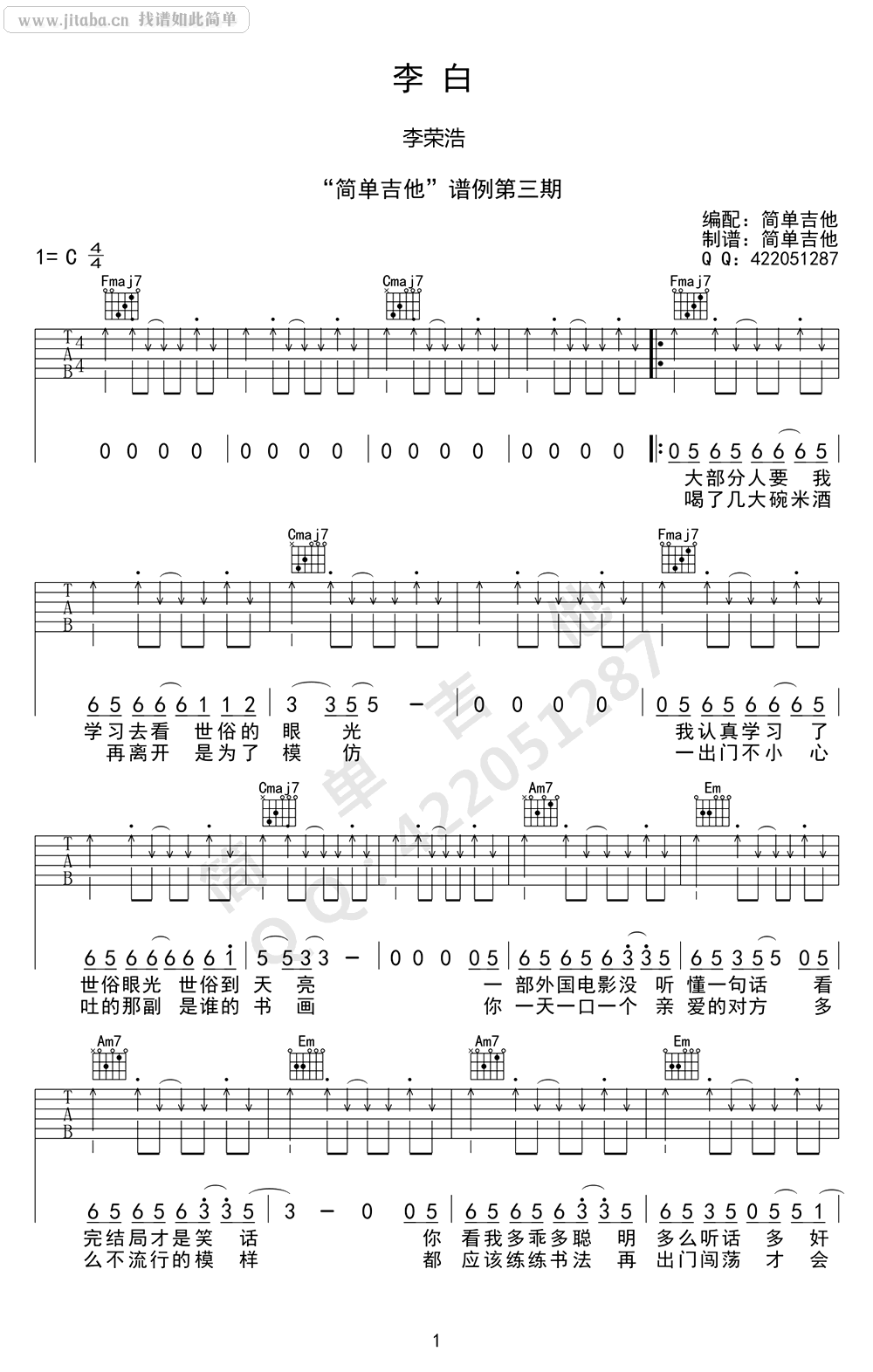 曲谱介绍: 李荣浩《李白》吉他弹唱谱,采用C调指法编配,简单吉他编配出品,共有3张高清图谱。