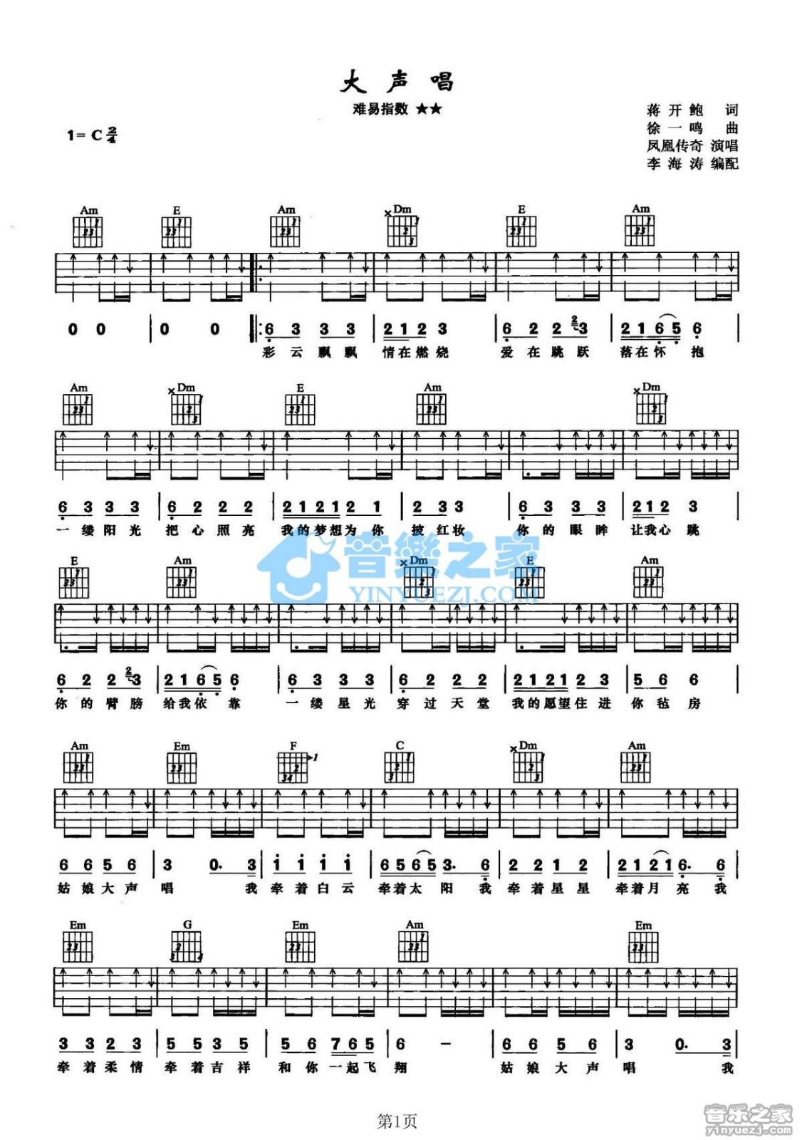 曲谱介绍: 凤凰传奇《大声唱》吉他弹唱谱,采用C调指法编配,音乐之家编配出品,共有2张高清图谱,免翻页排版设计。