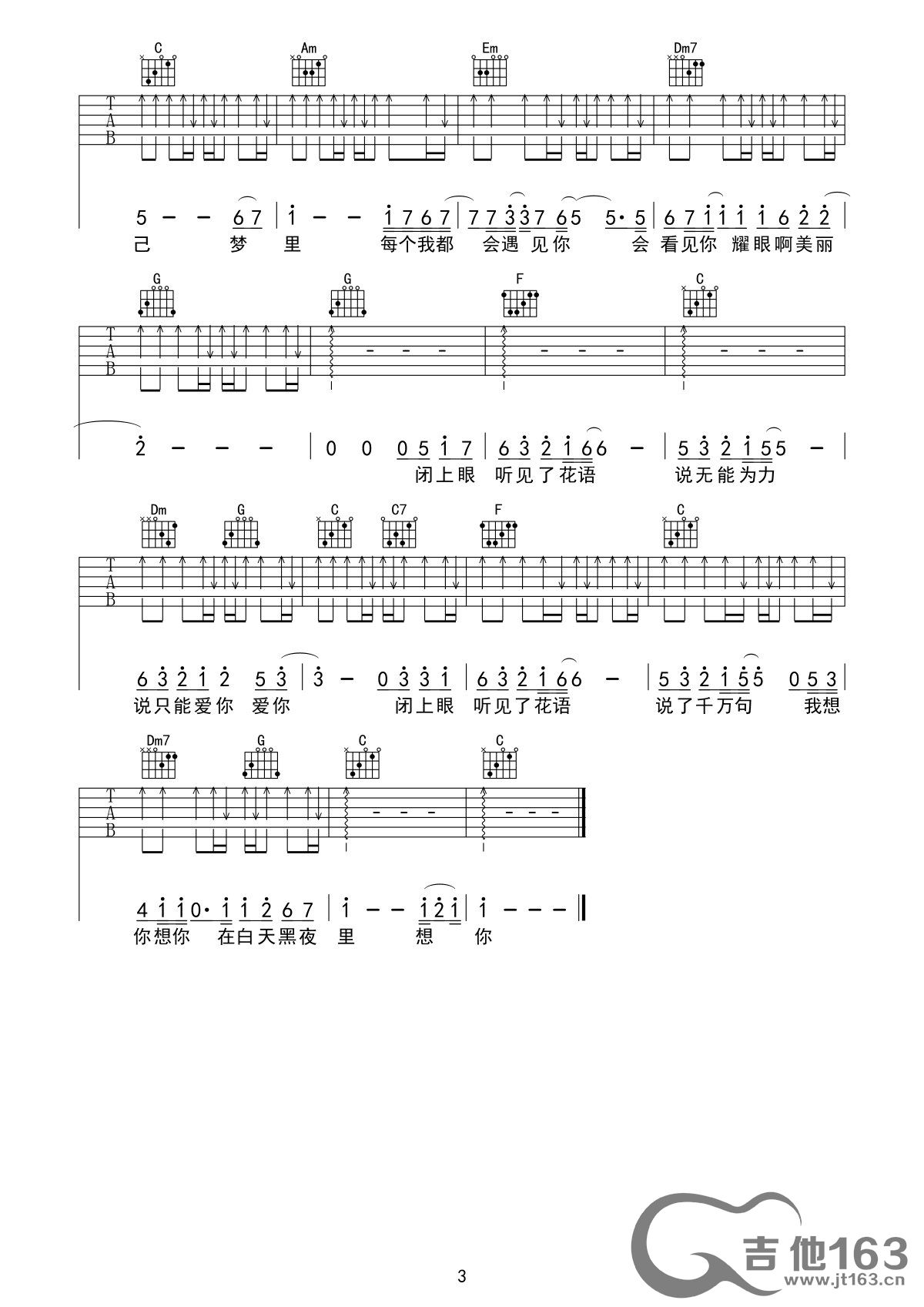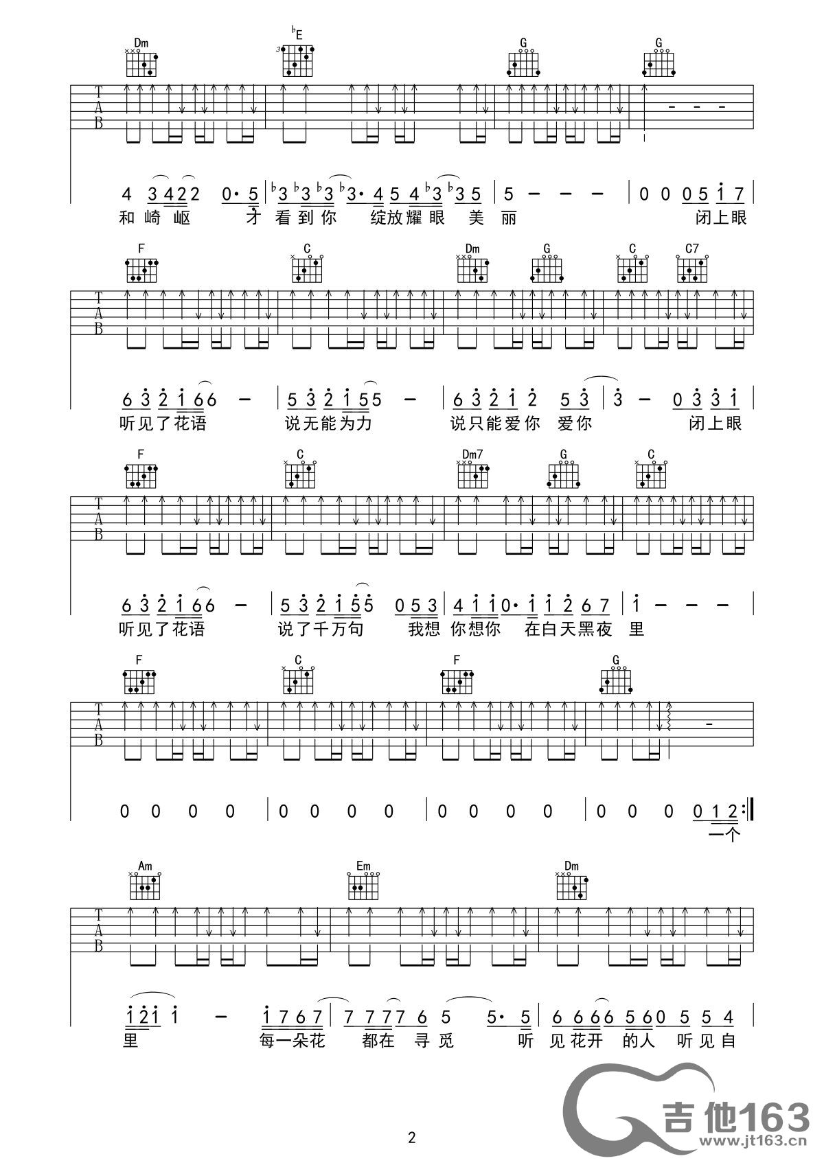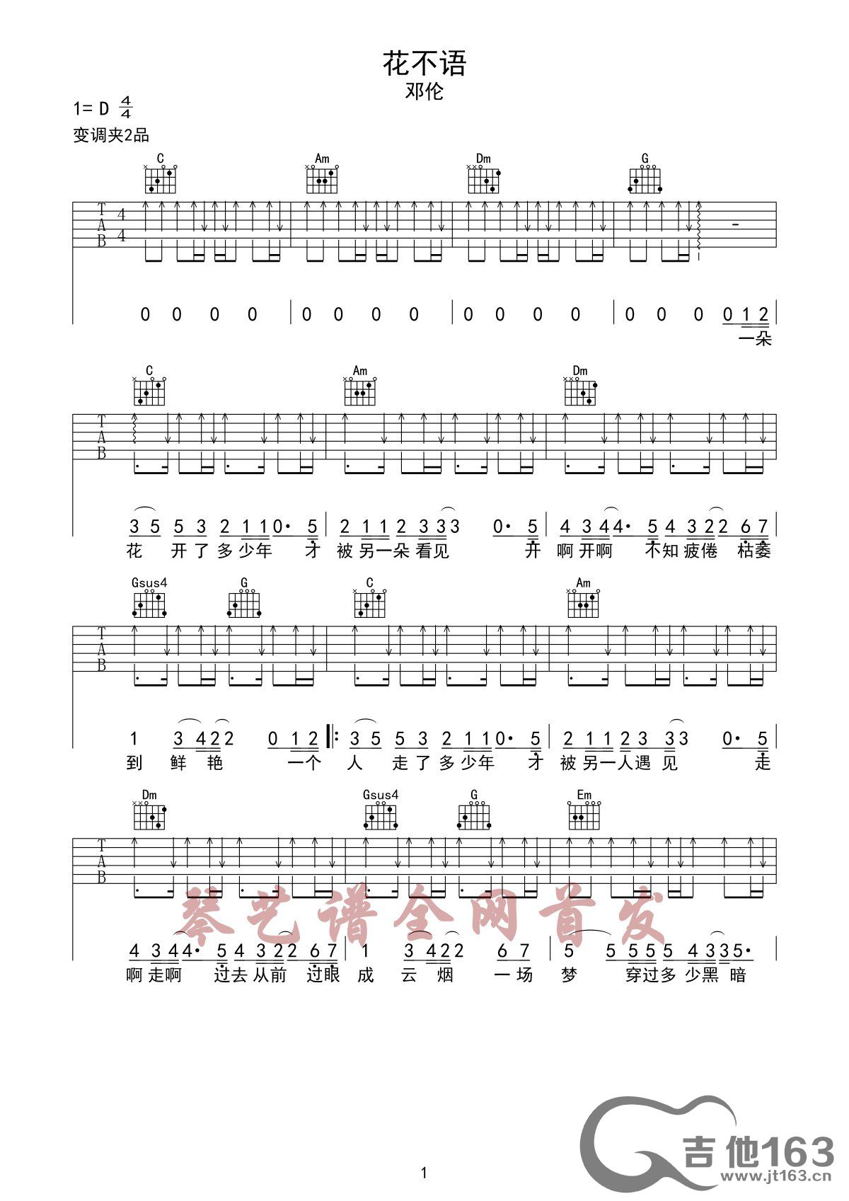 曲谱介绍: 邓伦《花不语》吉他弹唱谱,采用D调指法编配,琴艺谱编配出品,共有3张高清图谱。